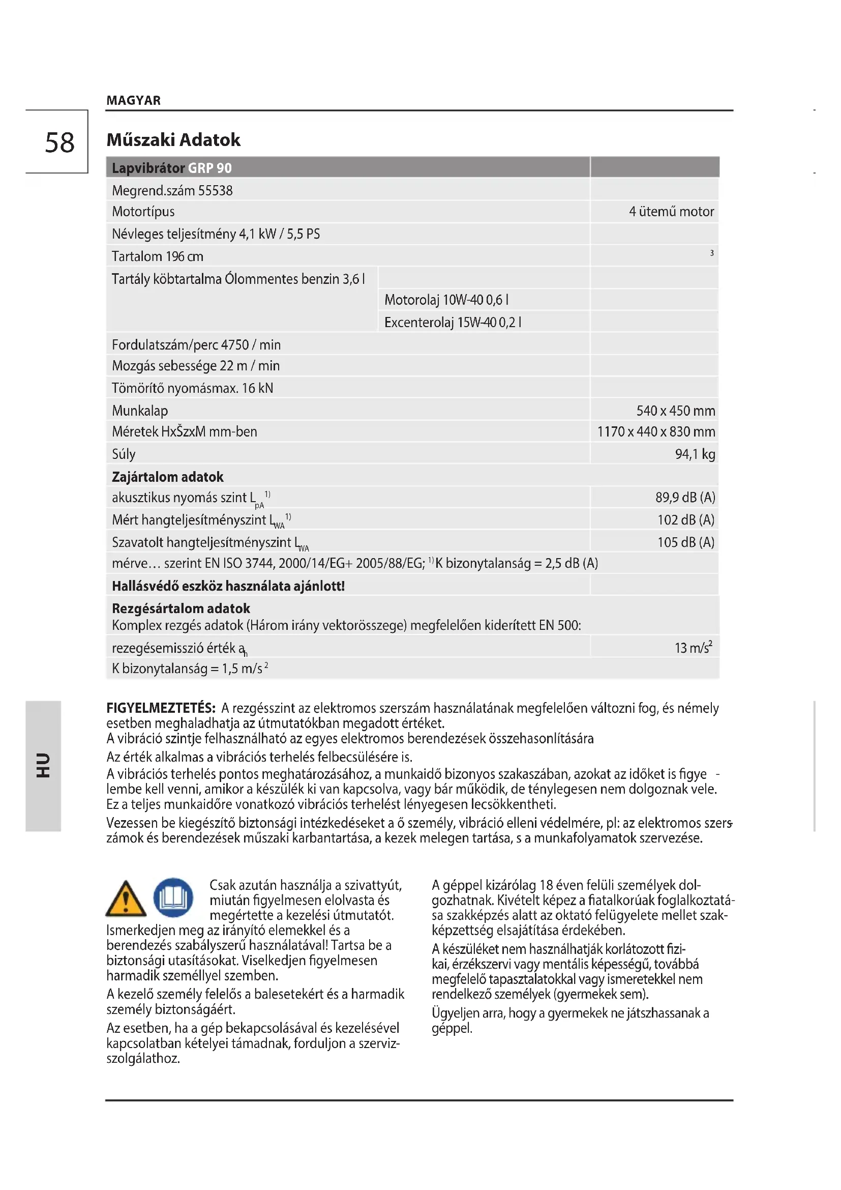Tartály köbtartalma Ólommentes benzin 3,6 l Motorolaj 10W-40 0,6 l Excenterolaj 15W-40 0,2 l Fordulatszám/perc 4750 / min Mozgás sebessége 22 m / min Tömörítő nyomásmax. 16 kN Munkalap 540 x 450 mm Méretek HxŠzxM mm-ben 1170 x 440 x 830 mm Súly 94,1 kg Zajártalom adatok akusztikus nyomás szint L