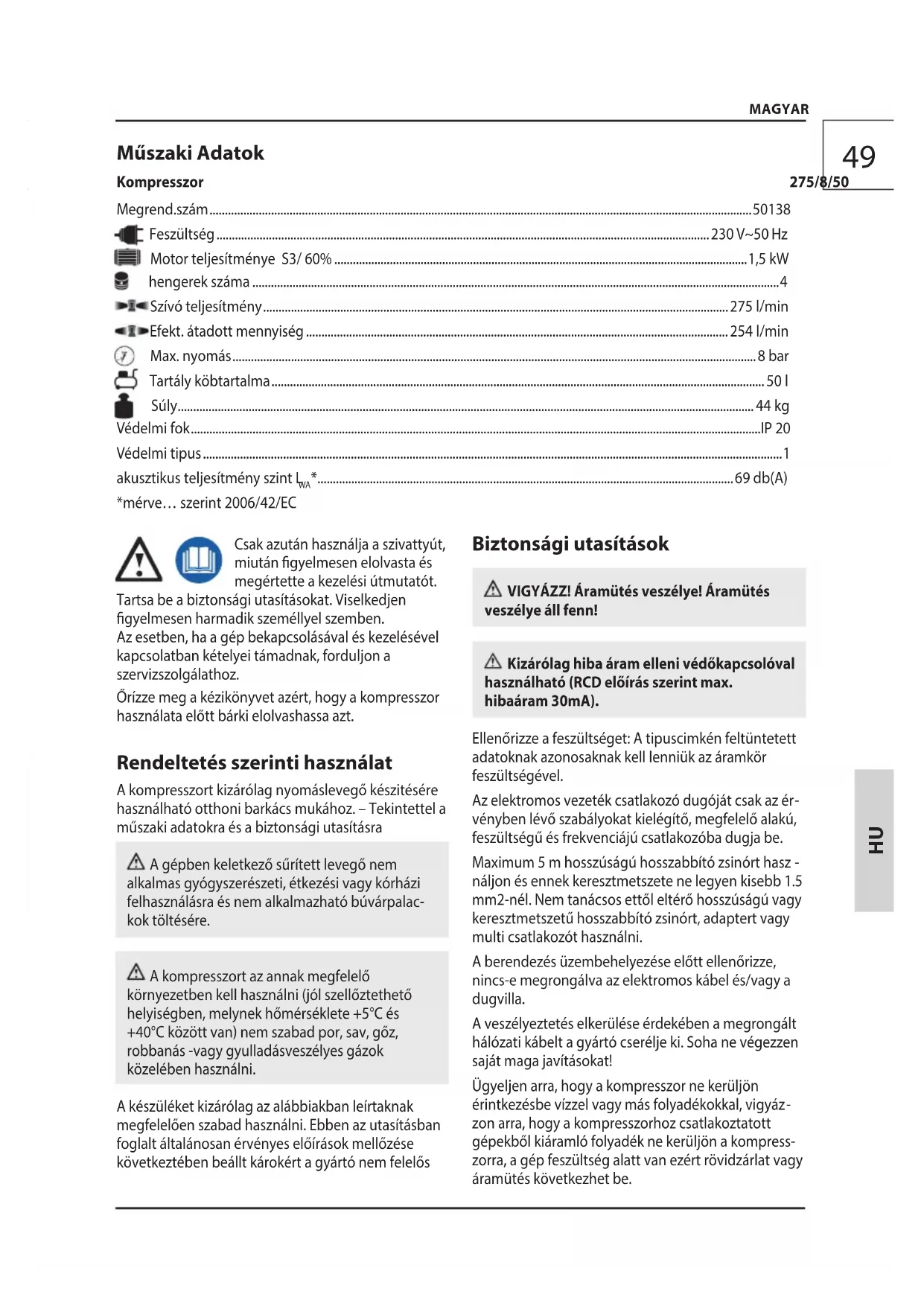 - ....................................................................................................................................... 69 db(A) *mérve… szerint 2006/42/EC Csak azután használja a szivattyút, miután gyelmesen elolvasta és megértette a kezelési útmutatót. Tartsa be a biztonsági utasításokat. Viselkedjen gyelmesen harmadik személlyel szemben. Az esetben, ha a gép bekapcsolásával és kezelésével kapcsolatban kételyei támadnak, forduljon a szervizszolgálathoz. Őrízze meg a kézikönyvet azért, hogy a kompresszor használata előtt bárki elolvashassa azt. Rendeltetés szerinti használat A kompresszort kizárólag nyomáslevegő készitésére használható otthoni barkács mukához. – Tekintettel a műszaki adatokra és a biztonsági utasításra A gépben keletkező sűrített levegő nem alkalmas gyógyszerészeti, étkezési vagy kórházi felhasználásra és nem alkalmazható búvárpalac- kok töltésére. A kompresszort az annak megfelelő környezetben kell használni (jól szellőztethető helyiségben, melynek hőmérséklete +5°C és +40°C között van) nem szabad por, sav, gőz, robbanás -vagy gyulladásveszélyes gázok közelében használni. A készüléket kizárólag az alábbiakban leírtaknak megfelelően szabad használni. Ebben az utasításban foglalt általánosan érvényes előírások mellőzése következtében beállt károkért a gyártó nem felelős Biztonsági utasítások VIGYÁZZ! Áramütés veszélye! Áramütés veszélye áll fenn! Kizárólag hiba áram elleni védőkapcsolóval használható (RCD előírás szerint max. hibaáram 30mA). Ellenőrizze a feszültséget: A tipuscimkén feltüntetett adatoknak azonosaknak kell lenniük az áramkör feszültségével. Az elektromos vezeték csatlakozó dugóját csak az ér