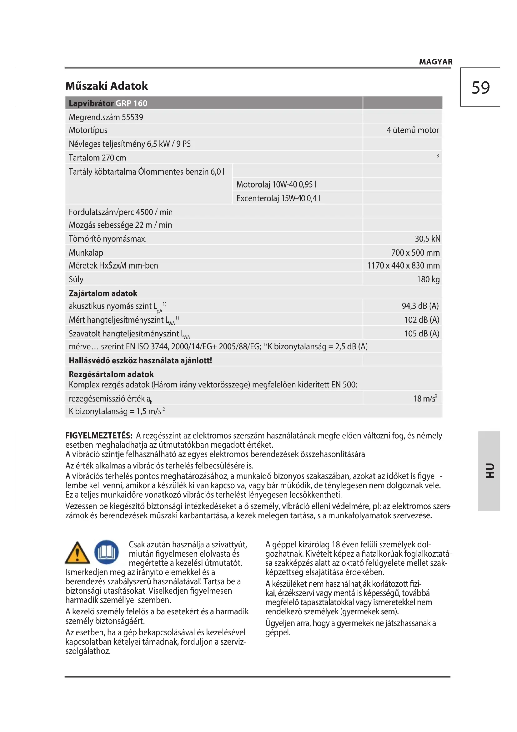 zegben, amelyben tűzveszélyes folyadékok, gázok vagy porok találhatók. A készüléket nem szabad mély (1,5 m-nél mélyebb) munkaárkokban, csatornákban és üregekben használni. A megmunkálandó területen nem lehetnek a rezgés következtében sérülésre hajlamos elektromos kábelek, valamint gáz- és vízvezetékek. Ebben az utasításban foglalt általánosan érvényes előírások mellőzése következtében beállt károkért a gyártó nem felelős A gép csak kifogástalan m?szaki állapotban és minden biztonsági tudnivaló gyelembe vétele mellett használható. A gép üzemeltetése a kezelő belátása szerint, saját felelősségére történik. Maradékveszélyek Az összes biztonsági előírás betartása és helyes alkalmazása esetén is fennállnak bizonyos maradvá- nykockázatok. Tűzveszély! Soha ne használja a készüléket tűzveszélyes anya