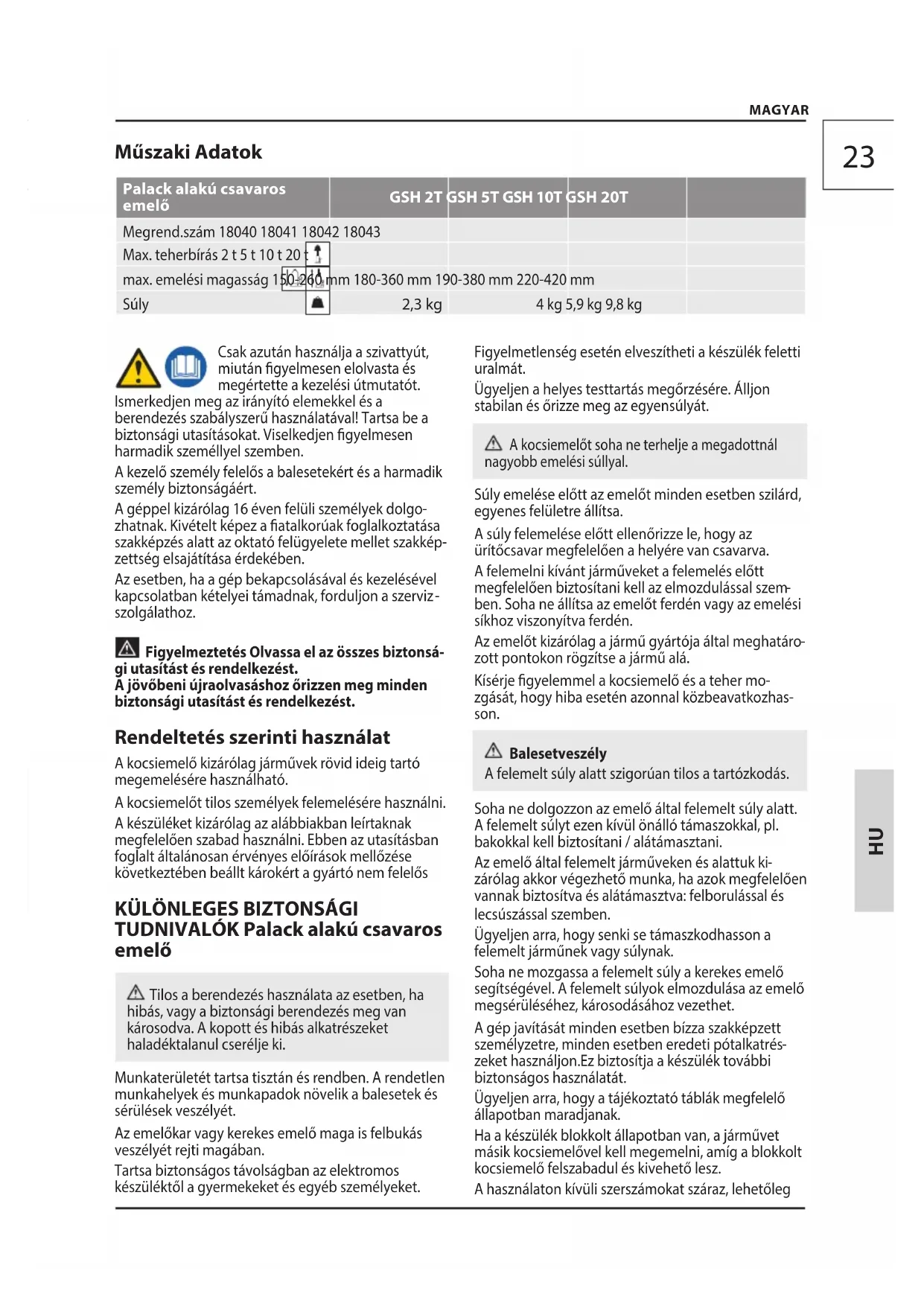 MAGYAR Műszaki Adatok Palack alakú csavaros emelő GSH 2T GSH 5T GSH 10T GSH 20T Megrend.szám 18040 18041 18042 18043 Max. teherbírás 2 t 5 t 10 t 20 t max. emelési magasság 150-260 mm 180-360 mm 190-380 mm 220-420 mm Súly 2,3 kg 4 kg 5,9 kg 9,8 kg Csak azután használja a szivattyút, miután gyelmesen elolvasta és megértette a kezelési útmutatót. Ismerkedjen meg az irányító elemekkel és a berendezés szabályszerű használatával! Tartsa be a biztonsági utasításokat. Viselkedjen gyelmesen harmadik személlyel szemben. A kezelő személy felelős a balesetekért és a harmadik személy biztonságáért. A géppel kizárólag 16 éven felüliszemélyek dolgo