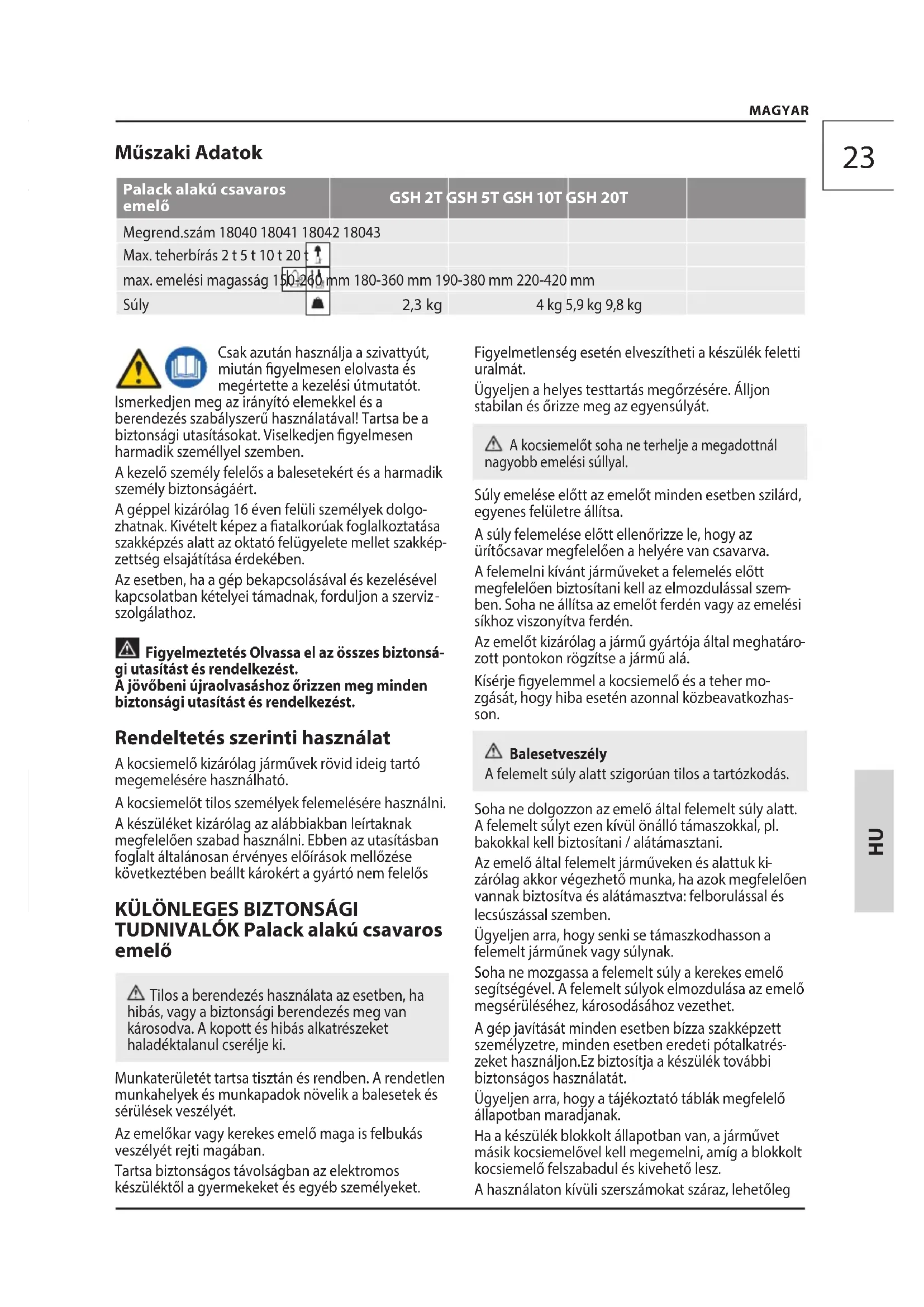 MAGYAR Műszaki Adatok Palack alakú csavaros emelő GSH 2T GSH 5T GSH 10T GSH 20T Megrend.szám 18040 18041 18042 18043 Max. teherbírás 2 t 5 t 10 t 20 t max. emelési magasság 150-260 mm 180-360 mm 190-380 mm 220-420 mm Súly 2,3 kg 4 kg 5,9 kg 9,8 kg Csak azután használja a szivattyút, miután gyelmesen elolvasta és megértette a kezelési útmutatót. Ismerkedjen meg az irányító elemekkel és a berendezés szabályszerű használatával! Tartsa be a biztonsági utasításokat. Viselkedjen gyelmesen harmadik személlyel szemben. A kezelő személy felelős a balesetekért és a harmadik személy biztonságáért. A géppel kizárólag 16 éven felüliszemélyek dolgo