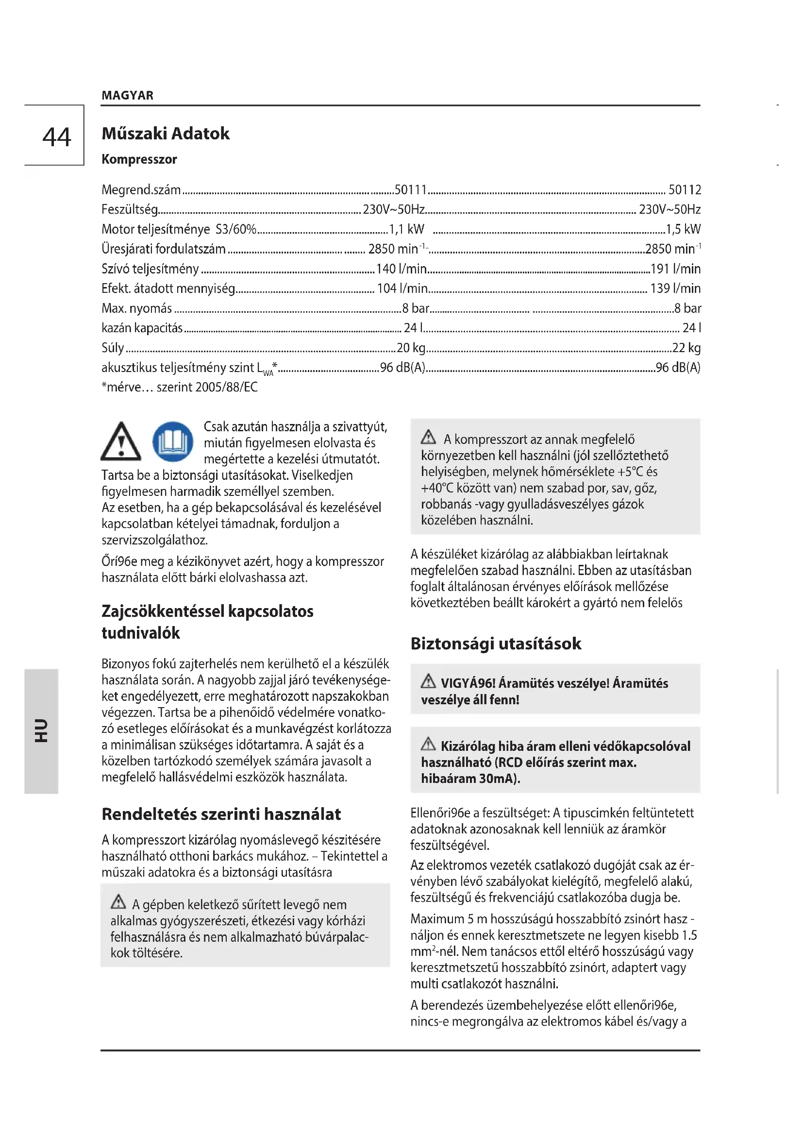 - Csak azután használja a szivattyút, miután gyelmesen elolvasta és megértette a kezelési útmutatót. Tartsa be a biztonsági utasításokat. Viselkedjen gyelmesen harmadik személlyel szemben. Az esetben, ha a gép bekapcsolásával és kezelésével kapcsolatban kételyei támadnak, forduljon a szervizszolgálathoz. Őrí96e meg a kézikönyvet azért, hogy a kompresszor használata előtt bárki elolvashassa azt. Zajcsökkentéssel kapcsolatos tudnivalók Bizonyos fokú zajterhelés nem kerülhető el a készülék használata során. A nagyobb zajjal járó tevékenysége- ket engedélyezett, erre meghatározott napszakokban végezzen. Tartsa be a pihenőidő védelmére vonatko- zó esetleges előírásokat és a munkavégzést korlátozza a minimálisan szükséges időtartamra. A saját és a közelben tartózkodó személyek számára javasolt a megfelelő hallásvédelmi eszközök használata. Rendeltetés szerinti használat A kompresszort kizárólag nyomáslevegő készitésére használható otthoni barkács mukához. – Tekintettel a műszaki adatokra és a biztonsági utasításra A gépben keletkező sűrített levegő nem alkalmas gyógyszerészeti, étkezési vagy kórházi felhasználásra és nem alkalmazható búvárpalac- kok töltésére. MAGYAR Műszaki Adatok Kompresszor Megrend.szám p. 5011
