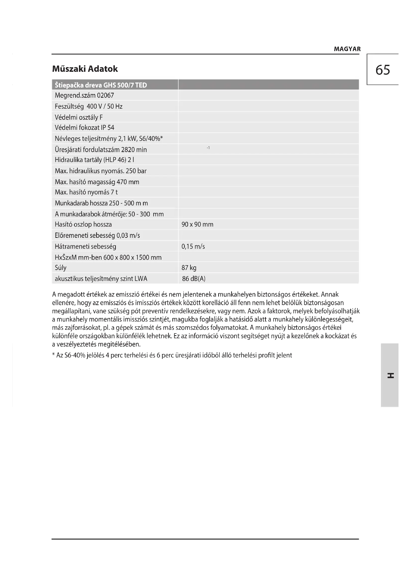 Hidraulika tartály (HLP 46) 2 l Max. hidraulikus nyomás. 250 bar Max. hasító magasság 470 mm Max. hasító nyomás 7 t Munkadarab hossza 250 - 500 m m A munkadarabok átmérője: 50 - 300 mm Hasító oszlop hossza 90 x 90 mm Előremeneti sebesség 0,03 m/s Hátrameneti sebesség 0,15 m/s HxŠzxM mm-ben 600 x 800 x 1500 mm Súly 87 kg akusztikus teljesítmény szint LWA 86 dB(A) A megadott értékek az emisszió értékei és nem jelentenek a munkahelyen biztonságos értékeket. Annak ellenére, hogy az emissziós és imissziós értékek között korelláció áll fenn nem lehet belőlük biztonságosan megállapítani, vane szükség pót preventív rendelkezésekre, vagy nem. Azok a faktorok, melyek befolyásolhatják a munkahely momentális imissziós szintjét, magukba foglalják a hatásidő alatt a munkahely különlegességeit, más zajforrásokat, pl. a gépek számát és más szomszédos folyamatokat. A munkahely biztonságos értékei különféle országokban különfélék lehetnek. Ez az információ viszont segítséget nyújt a kezelőnek a kockázat és a veszélyeztetés megitélésében.
