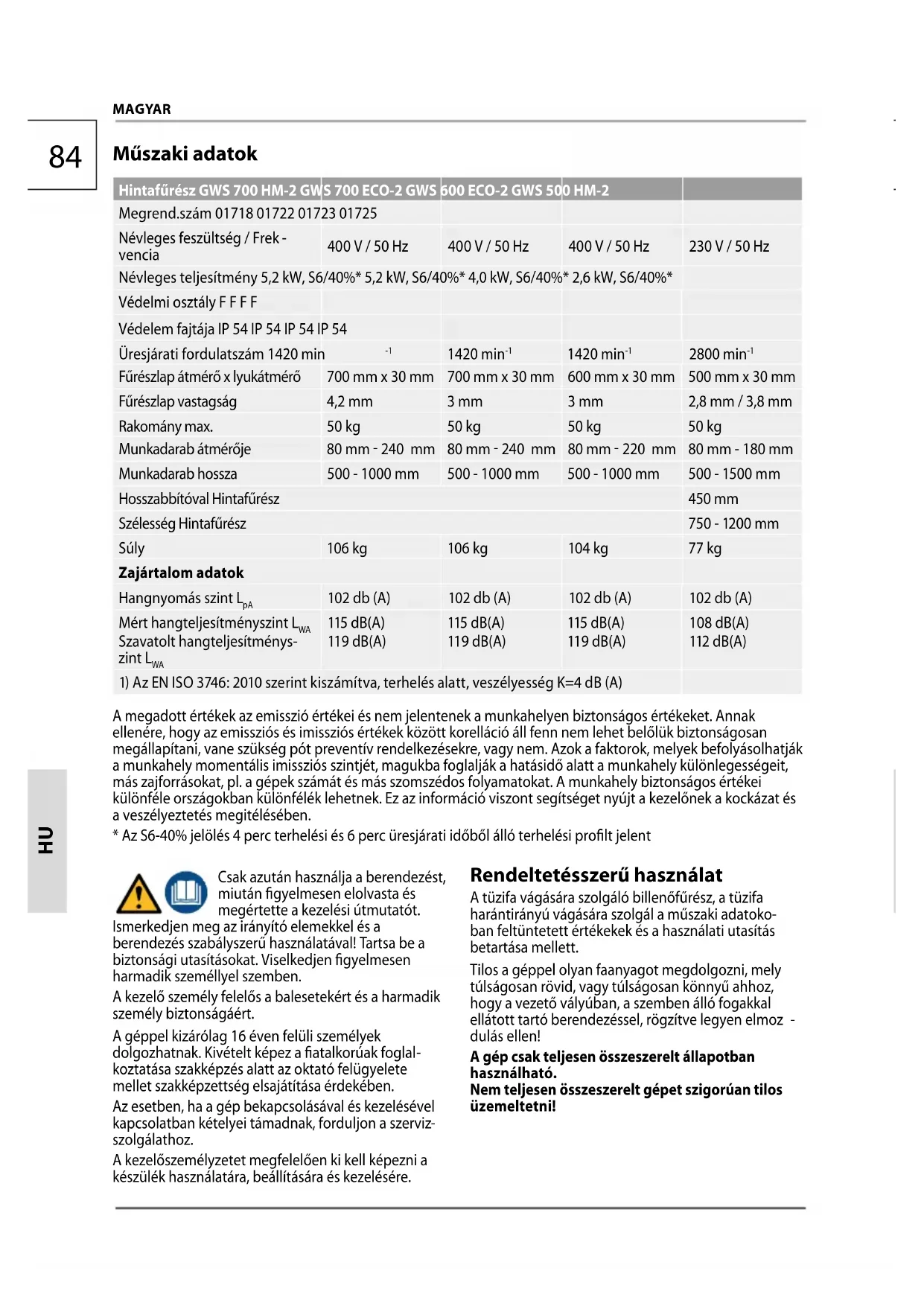 Műszaki adatok Hintafűrész GWS 700 HM-2 GWS 700 ECO-2 GWS 600 ECO-2 GWS 500 HM-2 Megrend.szám 01718 01722 01723 01725 Névleges feszültség / Frek