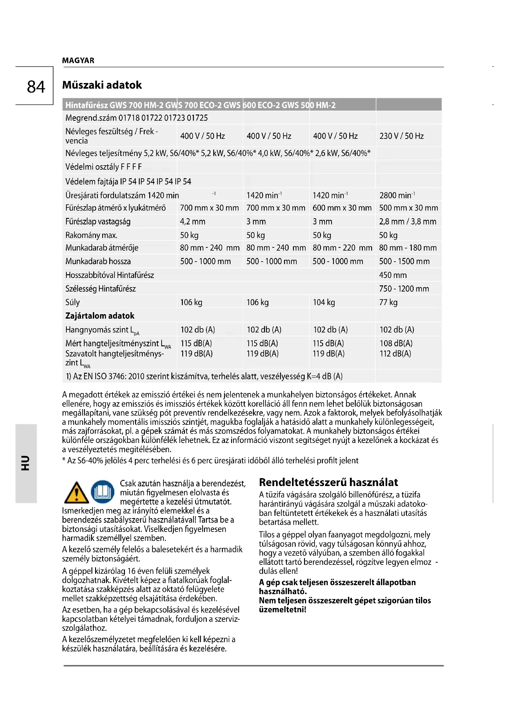 Műszaki adatok Hintafűrész GWS 700 HM-2 GWS 700 ECO-2 GWS 600 ECO-2 GWS 500 HM-2 Megrend.szám 01718 01722 01723 01725 Névleges feszültség / Frek