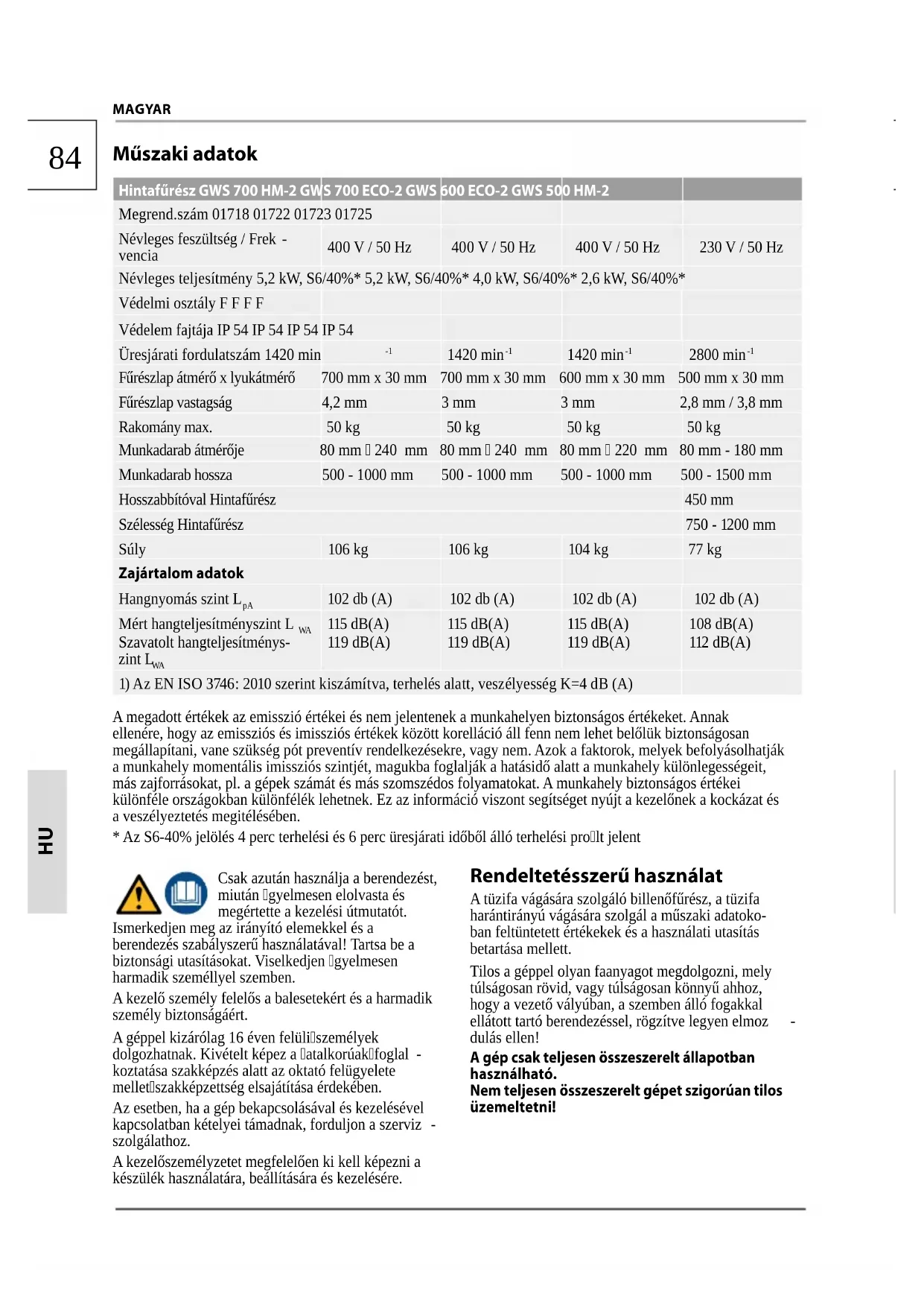 Műszaki adatok Hintafűrész GWS 700 HM-2 GWS 700 ECO-2 GWS 600 ECO-2 GWS 500 HM-2 Megrend.szám 01718 01722 01723 01725 Névleges feszültség / Frek