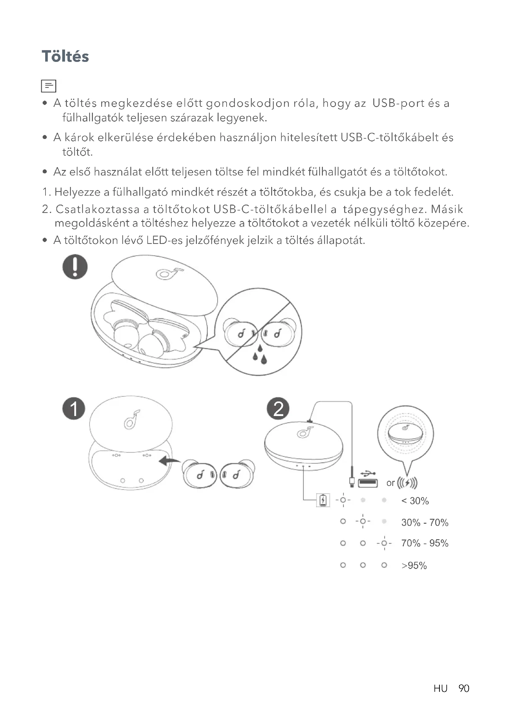 - A töltés megkezdése előtt gondoskodjon róla, hogy az USB-port és a fülhallgatók teljesen szárazak legyenek.