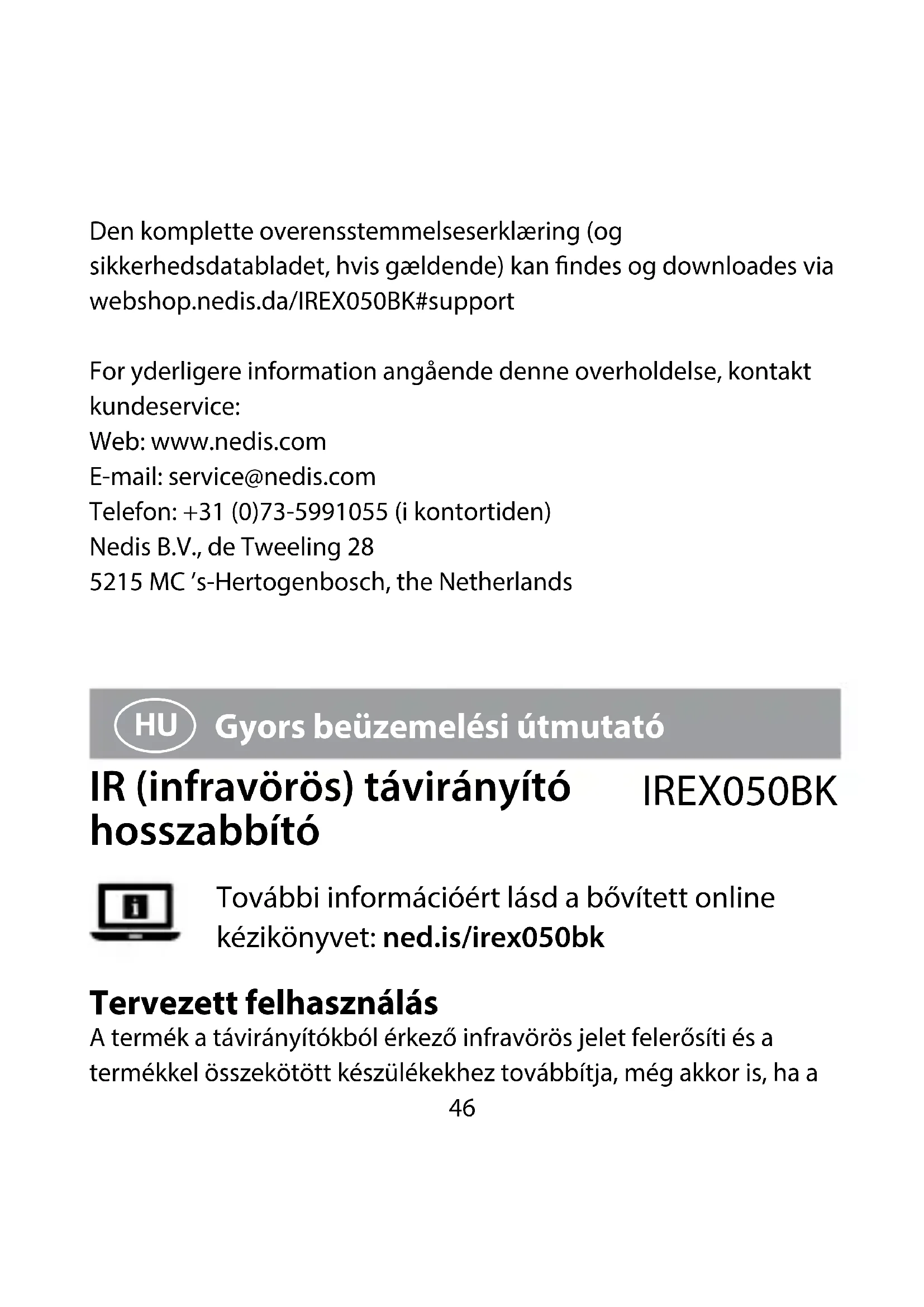 márkájú, Kínában gyártott IREX050BK terméket az összes vonatkozó CE szabvány és előírás szerint bevizsgáltuk, és a termék minden vizsgálaton sikeresen megfelelt. Ez magában foglalja – nem kizárólagos jelleggel – a rádióberendezésekről szóló 2014/53/EU irányelvet.50 A teljes megfelelőségi nyilatkozat (és ha van, akkor a biztonsági adatlap) a webshop.nedis.hu/IREX050BK#support címen elérhető és letölthető A megfelelőséggel kapcsolatos további információkért hívja az ügyfélszolgálatot: Web: www.nedis.com E-mail: service@nedis.com Telefon: +31 (0)73-5991055 (munkaidőben) Nedis B.V., de Tweeling 28 5215 MC ’s-Hertogenbosch, Hollandia