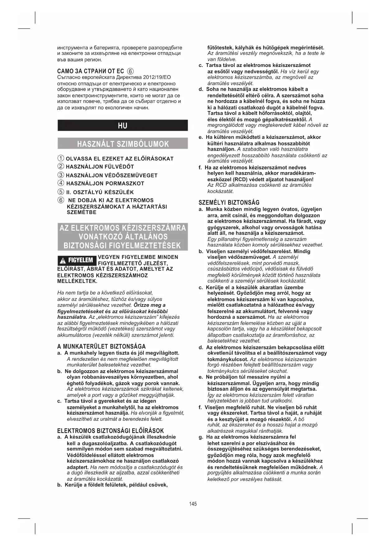 FIGYELEM VEGYEN FIGYELEMBE MINDEN FIGYELMEZTETŐ JELZÉST, ELŐÍRÁST, ÁBRÁT ÉS ADATOT, AMELYET AZ ELEKTROMOS KÉZISZERSZÁMHOZ MELLÉKELTEK. Ha nem tartja be a következő előírásokat, akkor az áramütéshez, tűzhöz és/vagy súlyos személyi sérülésekhez vezethet. Őrizze meg a gyelmeztetéseket és az előírásokat későbbi használatra. Az „elektromos kéziszerszám” kifejezés az alábbi gyelmeztetések mindegyikében a hálózati feszültségről működő (vezetékes) szerszámot vagy akkumulátoros (vezeték nélküli) szerszámot jelenti.