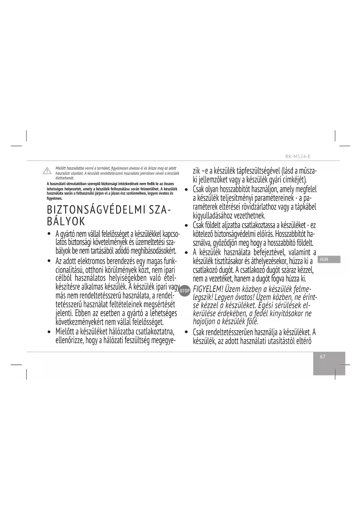 8 éven felüli gyermekek, továbbá testi, érzékszer- vi vagy szellemi fogyatékkal élők, illetve tapaszta- lat vagy ismeretek hiányában hozzá nem értő személyek használhatják a készüléket megfelelő felügyelet vagy a biztonságos használatra vonat- kozó útmutatások mellett, amennyiben tisztában vannak a használattal járó veszélyekkel. Ügyeljen, hogy a gyermekek ne használják a készüléket játék- szerként. A készülék tisztítását és karbantartását gyermekek kizárólag felügyelet mellett végezhetik.RK-M124-E