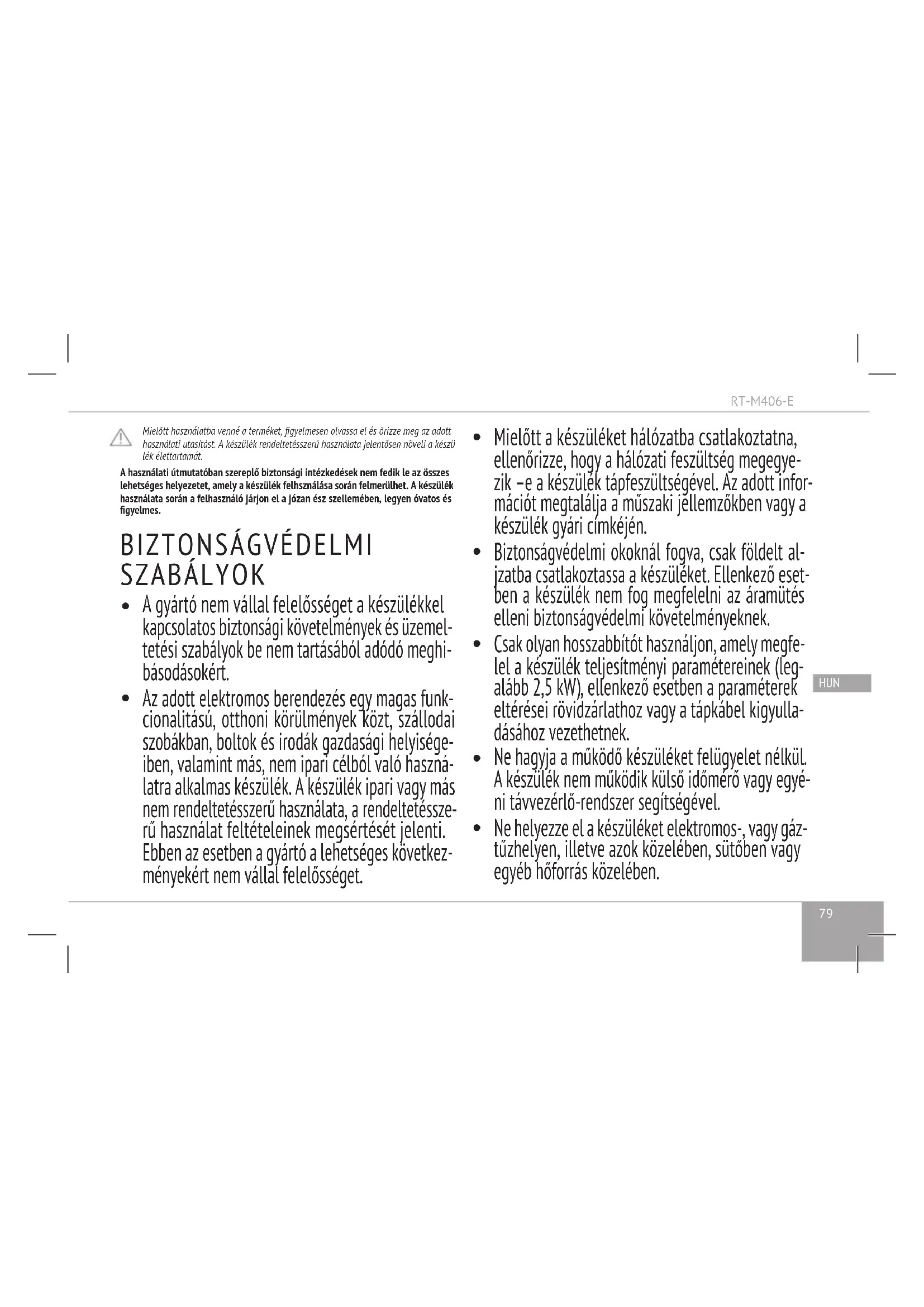 Ne helyezze a készüléket puha vagy nem hőálló felületre, üzemelés közben ne takarja le: ez a ké- szülék inkorrekt működéséhez és meghibásodásá- hoz vezethet.RТ-M406-E