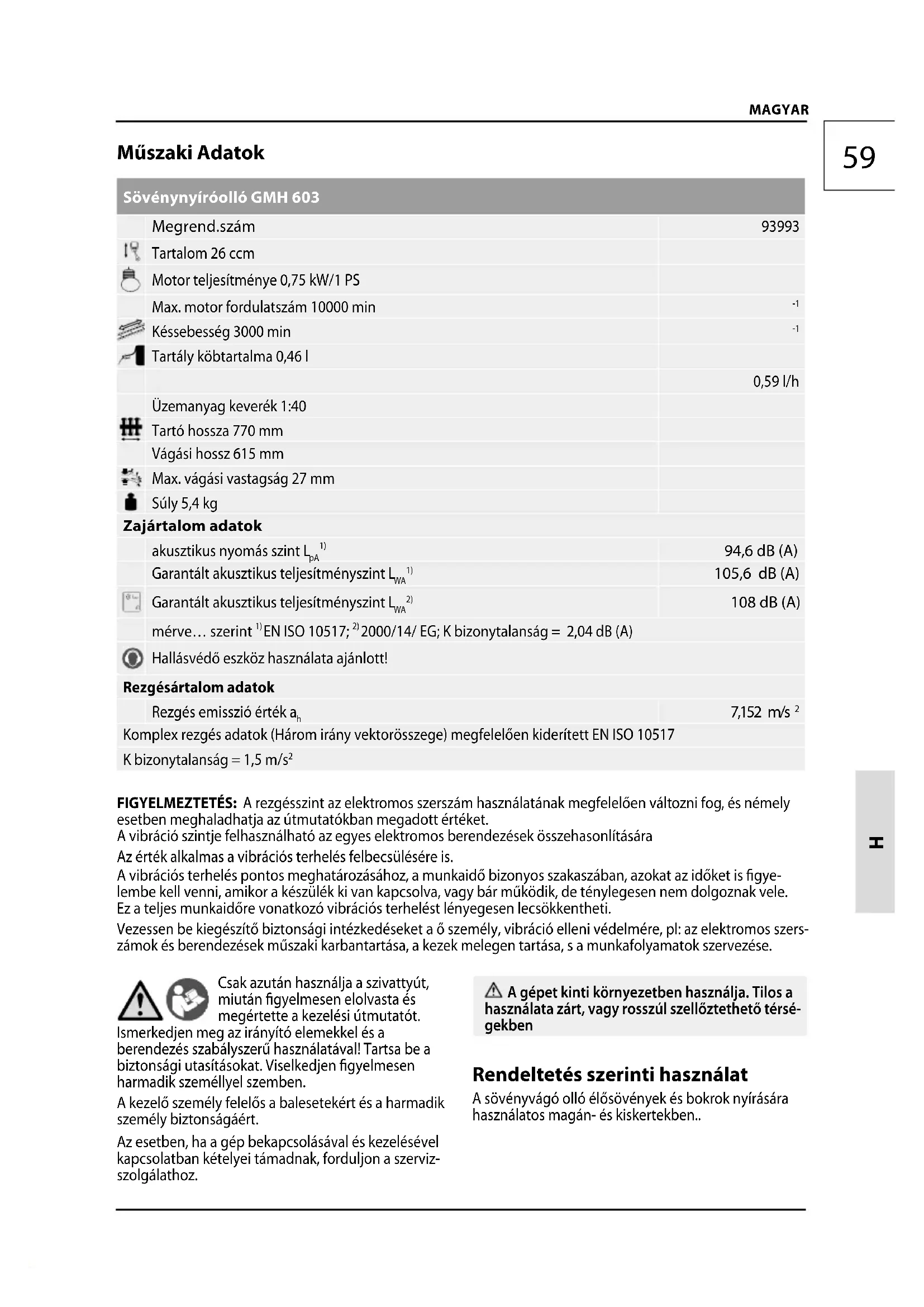 Tartály köbtartalma 0,46 l 0,59 l/h Üzemanyag keverék 1:40 Tartó hossza 770 mm Vágási hossz 615 mm Max. vágási vastagság 27 mm Súly 5,4 kg Zajártalom adatok akusztikus nyomás szint L