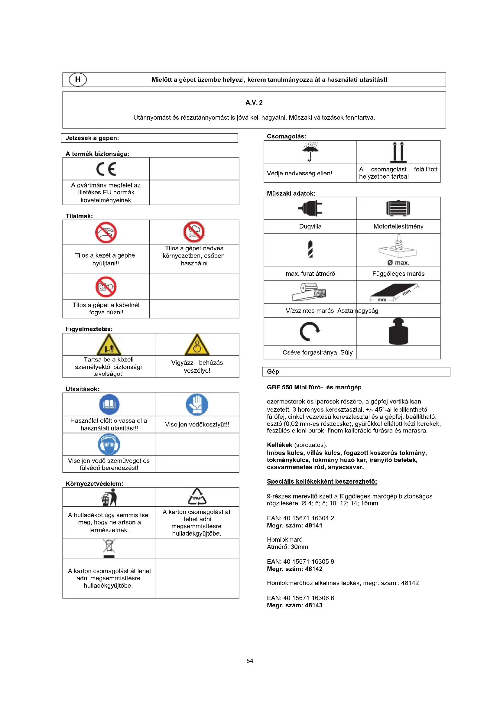 82 dB Súly: 49,2 kg Méretek H x Šz x M ( mm): 520 x 510 x 760 EAN: 40 15671 48140 5 Megr. szám.: 48140 55• Ha hosszú haja van, feltétlenül viseljen hajvédő hálót, vagy munkasapkát.