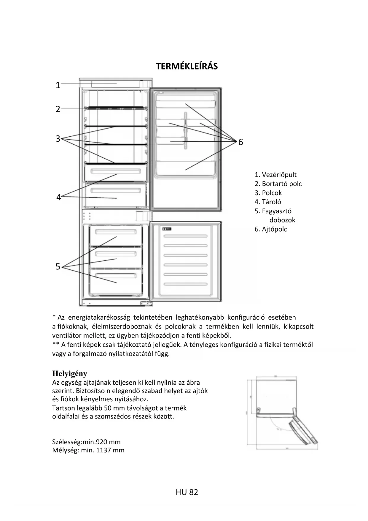 - Az energiatakarékosság tekintetében leghatékonyabb konfiguráció esetébena fiókoknak, élelmiszerdoboznak és polcoknak a termékben kell lenniük, kikapcsoltventilátor mellett, ez ügyben tájékozódjon a fenti képekből.** A fenti képek csak tájékoztató jellegűek. A tényleges konfiguráció a fizikai terméktőlvagy a forgalmazó nyilatkozatától függ.Helyigény Az egység ajtajának teljesen ki kell nyílnia az ábra szerint. Biztosítso n elegendő szabad helyet az ajtók és fiókok kényelmes nyitásához. Tartson legalább 50 mm távolságot a termék oldalfalai és a szomszédos részek között. Szélesség:min.920 mmMélység: min. 1137 mm1. Vezérlőpult2. Bortartó polc3. Polcok4. Tároló5. Fagyasztódobozok6. Ajtópolc
