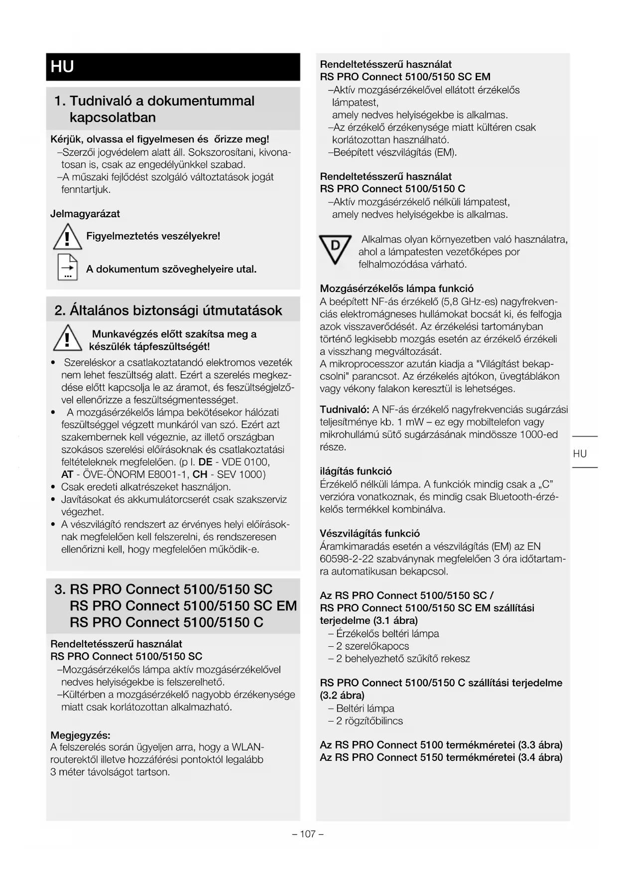 RS PRO Connect 5100/5150 SC EM RS PRO Connect 5100/5150 C Rendeltetésszerű használat RS PRO Connect 5100/5150 SC – Mozgásérzékelős lámpa aktív mozgásérzékelővel nedves helyiségekbe is felszerelhető. – Kültérben a mozgásérzékelő nagyobb érzékenysége miatt csak korlátozottan alkalmazható. Megjegyzés: A felszerelés során ügyeljen arra, hogy a WLAN- routerektől illetve hozzáférési pontoktól legalább 3 méter távolságot tartson. Rendeltetésszerű használat RS PRO Connect 5100/5150 SC EM – Aktív mozgásérzékelővel ellátott érzékelős lámpatest, amely nedves helyiségekbe is alkalmas. – Az érzékelő érzékenysége miatt kültéren csak korlátozottan használható. – Beépített vészvilágítás (EM). Rendeltetésszerű használat RS PRO Connect 5100/5150 C – Aktív mozgásérzékelő nélküli lámpatest, amely nedves helyiségekbe is alkalmas. Alkalmas olyan környezetben való használatra, ahol a lámpatesten vezetőképes por felhalmozódása várható. Mozgásérzékelős lámpa funkció A beépített NF-ás érzékelő (5,8 GHz-es) nagyfrekven- ciás elektromágneses hullámokat bocsát ki, és felfogja azok visszaverődését. Az érzékelési tartományban történő legkisebb mozgás esetén az érzékelő érzékeli a visszhang megváltozását. A mikroprocesszor azután kiadja a "Világítást bekap- csolni" parancsot. Az érzékelés ajtókon, üvegtáblákon vagy vékony falakon keresztül is lehetséges. Tudnivaló: A NF-ás érzékelő nagyfrekvenciás sugárzási teljesítménye kb. 1 mW – ez egy mobiltelefon vagy mikrohullámú sütő sugárzásának mindössze 1000-ed része. ilágítás funkció Érzékelő nélküli lámpa. A funkciók mindig csak a „C” verzióra vonatkoznak, és mindig csak Bluetooth-érzé- kelős termékkel kombinálva. Vészvilágítás funkció Áramkimaradás esetén a vészvilágítás (EM) az EN 60598-2-22 szabványnak megfelelően 3 óra időtartam- ra automatikusan bekapcsol. Az RS PRO Connect 5100/5150 SC / RS PRO Connect 5100/5150 SC EM szállítási terjedelme (3.1 ábra) – Érzékelős beltéri lámpa – 2 szerelőkapocs – 2 behelyezhető szűkítő rekesz RS PRO Connect 5100/5150 C szállítási terjedelme (3.2 ábra) – Beltéri lámpa – 2 rögzítőbilincs Az RS PRO Connect 5100 termékméretei (3.3 ábra) Az RS PRO Connect 5150 termékméretei (3.4 ábra) HU– 108 – Az RS PRO Connect 5100/5150 SC EM készülék áttekintése (3.5 ábra) A kábelcsavarozás B csavaros kupak C csatlakozókapocs D szerelőkapocs E zárósapkák F lámpaház G NF-érzékelő H takarólemez Az RS PRO Connect 5100/5150 C készülék áttekin- tése (3.6 ábra) A Csavaros kábelcsatlakozás B Csavarzár C Csatlakozókapocs D Szerelőbilincs E Végzáró sapkák F Lámpaház Érzékelési tartomány mennyezetre való szerelés esetén Ø 1–10m (3.7 ábra) Érzékelési tartomány falra való szerelés esetén Ø 1–10m (3.8 ábra) Fényerőeloszlás (3.9 - 3.14 ábra)