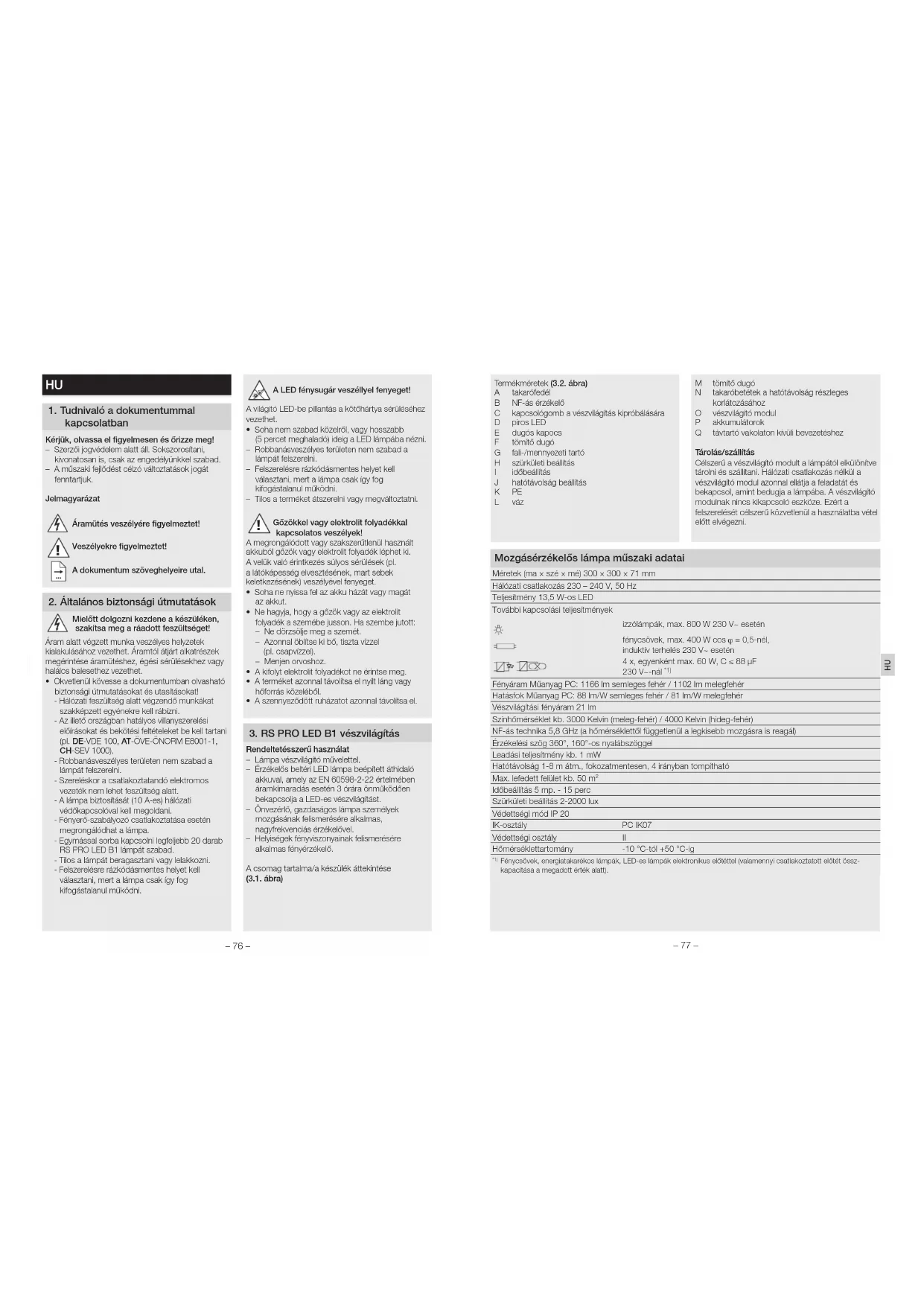 - A szennyeződött ruházatot azonnal távolítsa el. 3 RSPROLEDB1 vészvilágítás Rendeltetésszerű használat – Lámpa vészvilágító művelettel. – Érzékelős beltéri LED lámpa beépített áthidaló akkuval, amely az EN 60598-2-22 értelmében áramkimaradás esetén 3 órára önműködően bekapcsolja a LED-es vészvilágítást. – Önvezérlő, gazdaságos lámpa személyek mozgásának felismerésére alkalmas, nagyfrekvenciás érzékelővel. – Helyiségek fényviszonyainak felismerésére alkalmas fényérzékelő. A csomag tartalma/a készülék áttekintése (3.1. ábra) Termékméretek (3.2. ábra) A takarófedél B NF-ás érzékelő C kapcsológomb a vészvilágítás kipróbálására D piros LED E dugós kapocs F tömítő dugó G fali-/mennyezeti tartó H szürkületi beállítás I időbeállítás J hatótávolság beállítás K PE L váz M tömítő dugó N takaróbetétek a hatótávolság részleges korlátozásához O vészvilágító modul P akkumulátorok Q távtartó vakolaton kívüli bevezetéshez Tárolás/szállítás Célszerű a vészvilágító modult a lámpától elkülönítve tárolni és szállítani. Hálózati csatlakozás nélkül a vészvilágító modul azonnal ellátja a feladatát és bekapcsol, amint bedugja a lámpába. A vészvilágító modulnak nincs kikapcsoló eszköze. Ezért a felszerelését célszerű közvetlenül a használatba vétel előtt elvégezni. Mozgásérzékelős lámpa műszaki adataiHU 3 db. Panasonic NiMh, HHR 80AAAB, 1,2 V/750 mAó, AAA Akku töltése állandóan kb. 23 mAó-val, saját hőfejlődés nélkül Töltési idő: 24 ó (tartós hálózati feszültség esetén) Memóriahatás nincs Akku kapacitása/vészvilágítás időtartama : min. 3 ó *1) *1) A maximális kapacitás a lámpához adott akkukkal garantált. Fontos! Ha a vészvilágító modul világítási időtartama 3 óra alá csökken, ki kell cserélni a berakott akkukat. – 78 – – 79 – Megjegyzés: Ennek a lámpának a fényforrását csak a gyártó, vagy az általa megbízott szerviztechnikus szakember, vagy hasonló képesítésű, szakképzett személy cserélheti le. A szerelés lépései