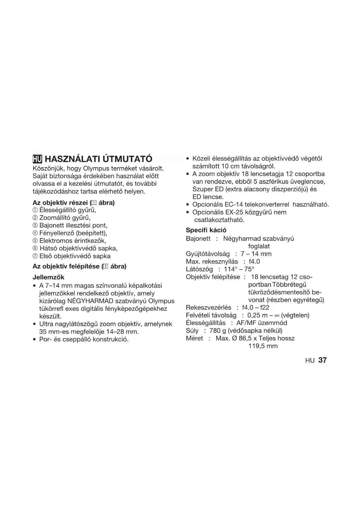 Közeli élességállítás az objektívvédő végétől számított 10 cm távolságról. A zoom objektív 18 lencsetagja 12 csoportba van rendezve, ebből 5 aszférikus üveglencse, Szuper ED (extra alacsony diszperziójú) és ED lencse. Opcionális EC-14 telekonverterrel használható. Opcionális EX-25 közgyűrű nem csatlakoztatható. Specifi káció Bajonett : Négyharmad szabványú foglalat Gyújtótávolság : 7 – 14 mm Max. rekesznyílás : f4.0 Látószög : 114° – 75° Objektív felépítése : 18 lencsetag 12 cso- portban Többrétegű tükröződésmentesítő be- vonat (részben egyrétegű) Rekeszvezérlés : f4.0 – f22 Felvételi távolság : 0,25 m – ∞ (végtelen) Élességállítás : AF/MF üzemmód Súly : 780 g (védősapka nélkül) Méret : Max. Ø 86,5 x Teljes hossz 119,5 mm