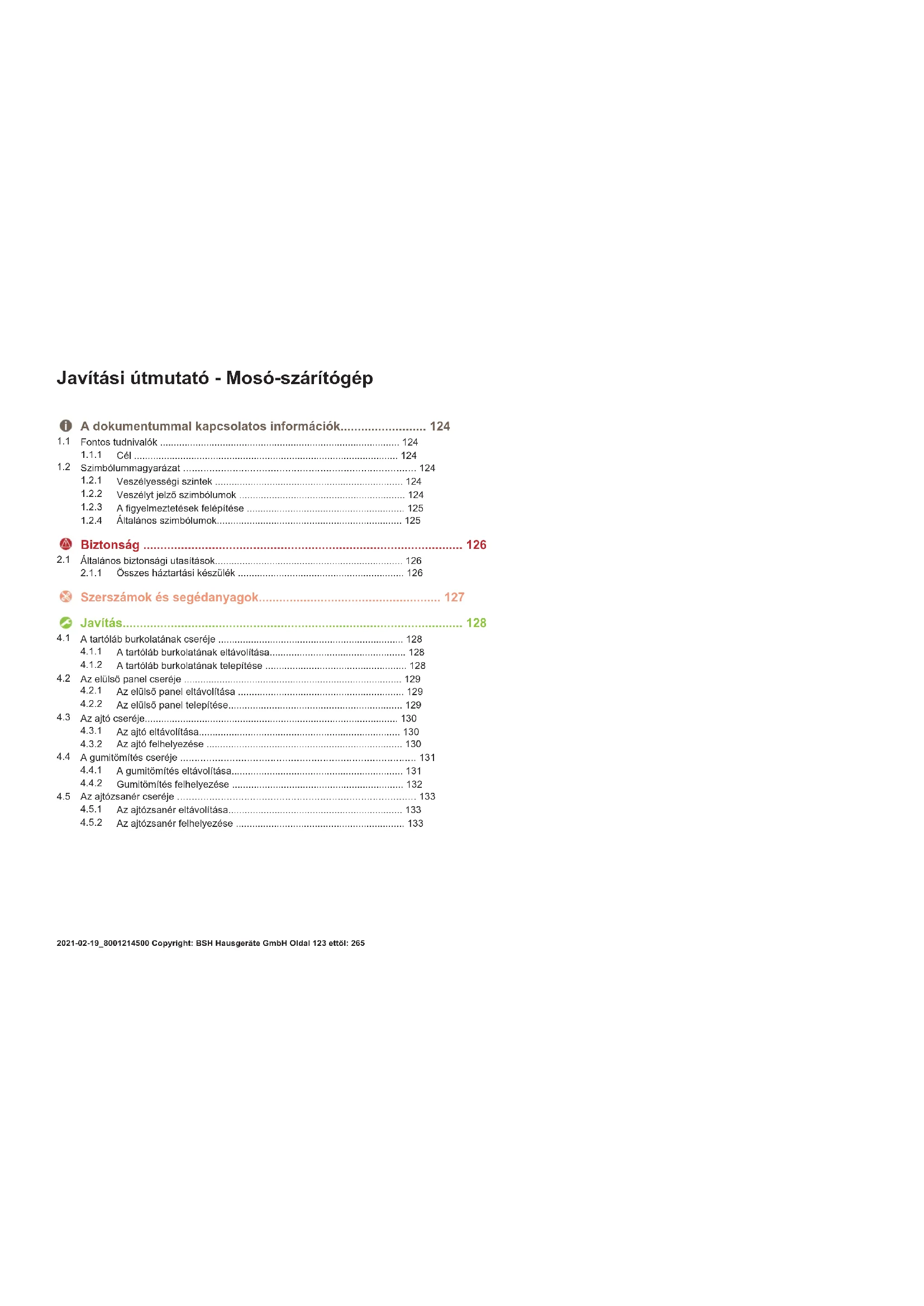 Az ajtózsanér felhelyezése ..............................................................133 Javítási útmutató-Mosó-szárítógép 2021-02-19_8001214500 Copyright: BSH Hausgeräte GmbH Oldal123ettől:265A dokumentummal kapcsolatos információk