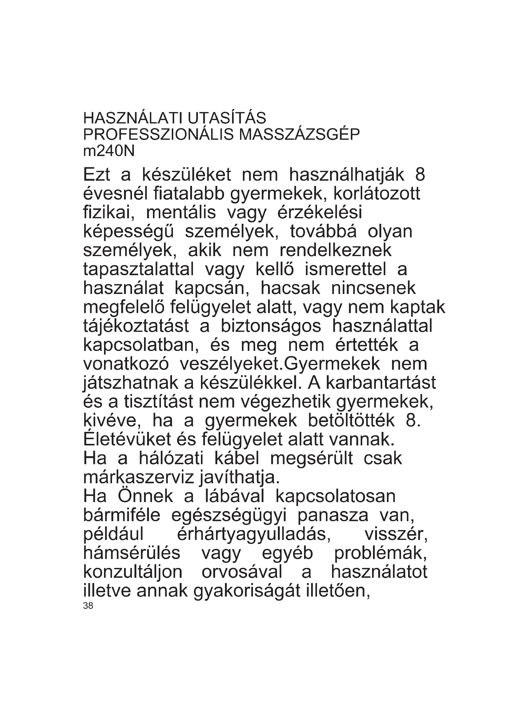C38 Ezt a készüléket nem használhatják 8 évesnél atalabb gyermekek, korlátozott zikai, mentális vagy érzékelési képességű személyek, továbbá olyan személyek, akik nem rendelkeznek tapasztalattal vagy kellő ismerettel a használat kapcsán, hacsak nincsenek megfelelő felügyelet alatt, vagy nem kaptak tájékoztatást a biztonságos használattal kapcsolatban, és meg nem értették a vonatkozó veszélyeket.Gyermekek nem játszhatnak a készülékkel. A karbantartást és a tisztítást nem végezhetik gyermekek, kivéve, ha a gyermekek betöltötték 8. Életévüket és felügyelet alatt vannak. Ha a hálózati kábel megsérült csak márkaszerviz javíthatja. Ha Önnek a lábával kapcsolatosan bármiféle egészségügyi panasza van, például érhártyagyulladás, visszér, hámsérülés vagy egyéb problémák, konzultáljon orvosával a használatot illetve annak gyakoriságát illetően,