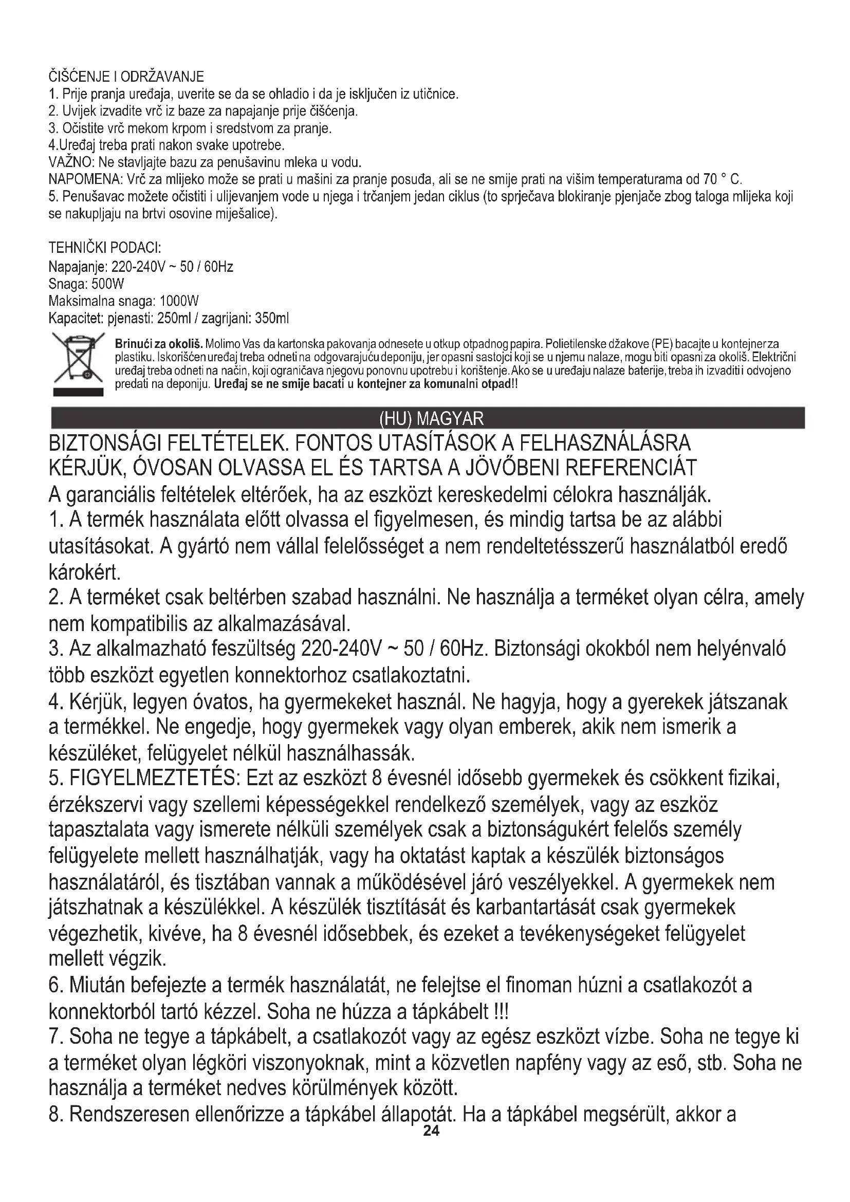 προϊόν για οποιονδήποτε σκοπό που δεν είναι συμβατό με την εφαρμογή του. Törődünk a természeti környezetért. Papír csomagokat kérünk adjanak át a papírhulladékra. Polietilén zacskókat (PE) dobjanak ki a műanyag tartályba. Kimerült gépe vissza kell adni a megfelelő taroló pontjához, mert a gépben levők veszélyes részek, veszedelmesek lehet a környezetnek. Az elektromos gép így kell visszaadni, hogy korlátozzon a re-használatát. Ha az elemek vannak a gépben, ki kell húzni ezeket és a visszakelladni külön tároló pontjához. (GR) ΕΛΛΑΔΑ MEGJEGYZÉS: A tejeskancsó mosogatógépben mosható, de 70 ° C / 158 ° F-nál magasabb hőmérsékleten nem szabad mosni. Maximális teljesítmény: 1000W FONTOS: Ne tegye a tejhabosító alapot vízbe. 5. A habosítót úgy is megtisztíthatja, hogy vizet önt bele és egy cikluson át futtatja (ez megakadályozza, hogy a habverő eltömődjön a keverő tengelyének tömítésén felhalmozódó tejüledékektől). Kapacitás: habosítva: 250 ml / melegítve: 350 ml MŰSZAKI ADATOK: Teljesítmény: 500W