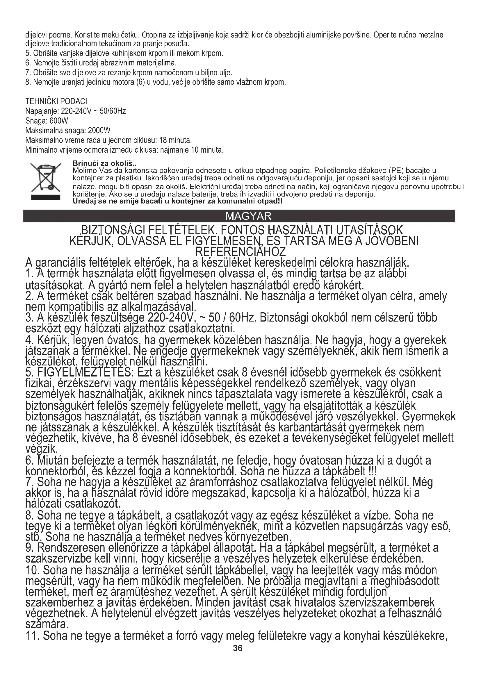 Tápellátás: 220-240V ~ 50/60Hz Teljesítmény: 600W Max teljesítmény: 2000W Maximális működési idő egy ciklusban: 18 perc. Minimális pihenőidő a ciklusok között: legalább 10 perc. A környezet védelme érdekében kérjük külön karton dobozok és műanyag zsákokat és dobja őket a megfelelő hulladék közé. Használt készüléket kell eljuttatni a kijelölt gyűjtőhelyekre miatt veszélyes elemek alkatrészeket, amelyek hatással lehetnek a környezetre. Ne dobja a készüléket a közös szemétkosárba. SUOMI
