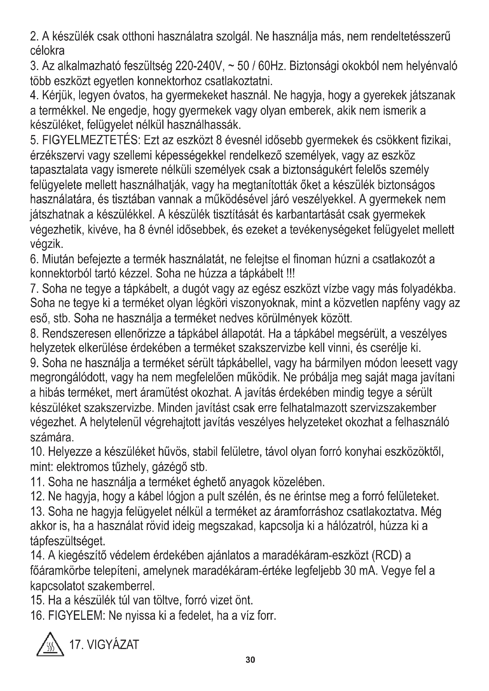 16. FIGYELEM: Ne nyissa ki a fedelet, ha a víz forr.