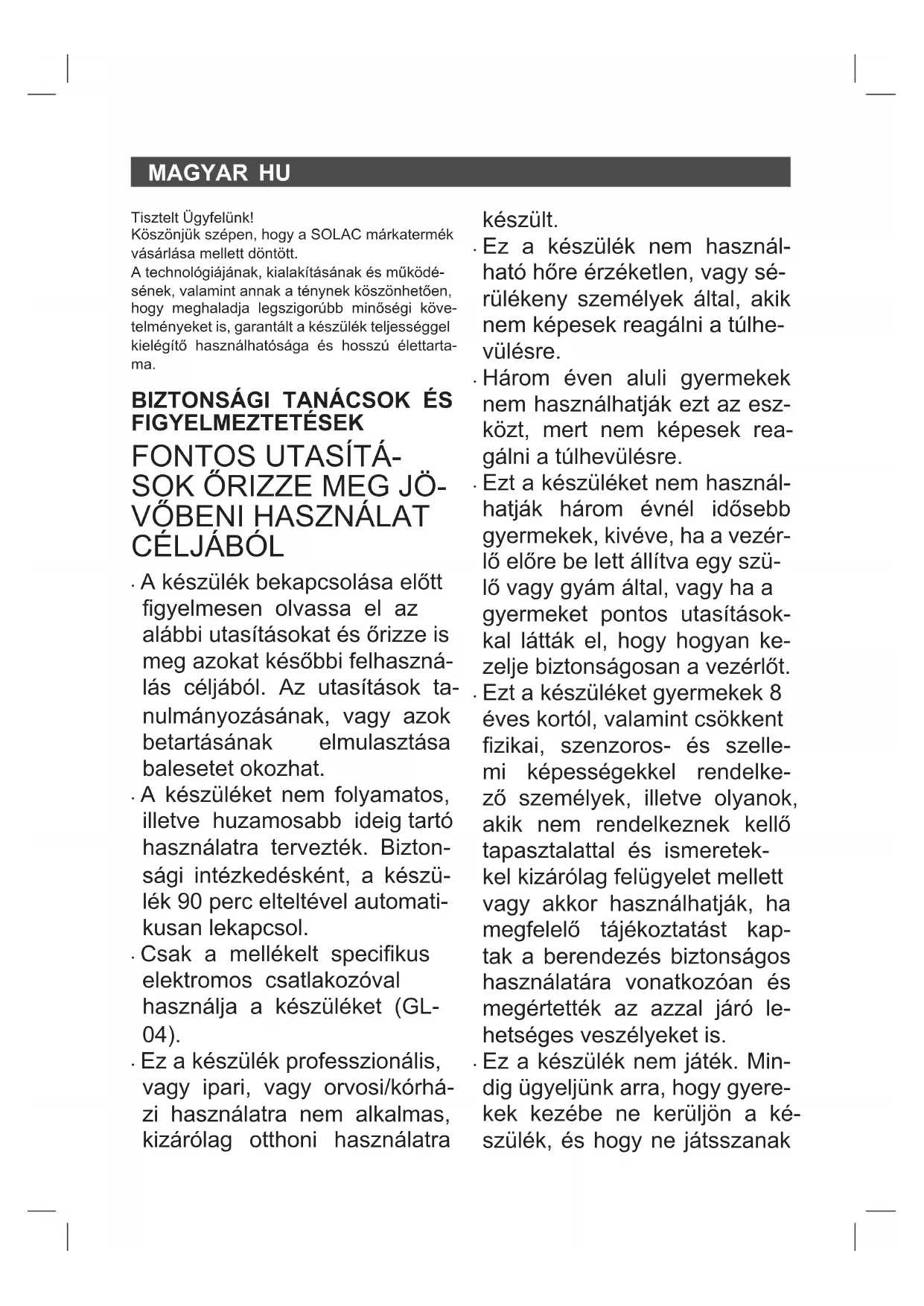 - A készüléket nem folyamatos, illetve huzamosabb ideig tartó használatra tervezték. Bizton- sági intézkedésként, a készü- lék 90 perc elteltével automati- kusan lekapcsol.