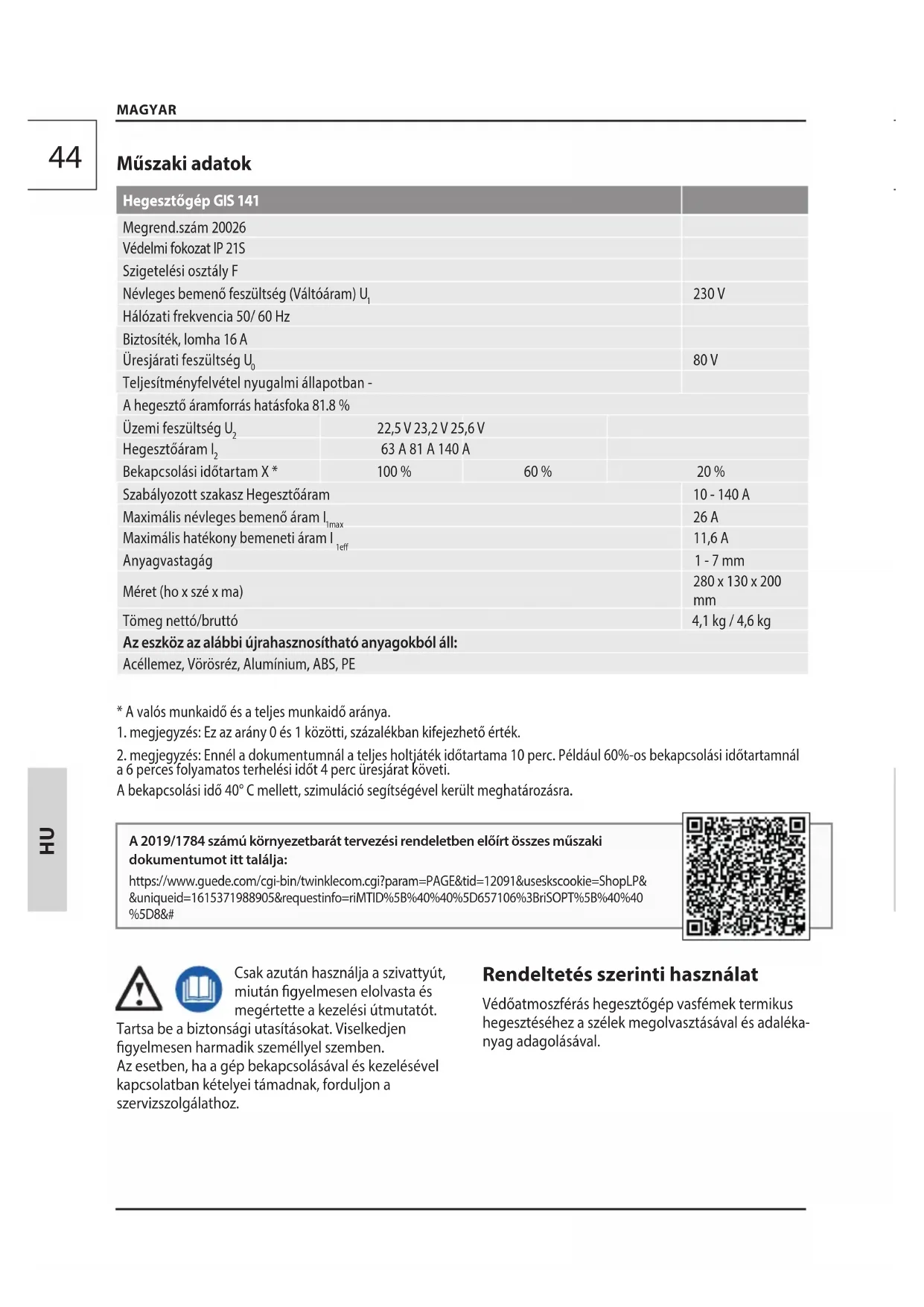 a 6perces folyamatos terhelési időt 4perc üresjárat követi. A bekapcsolási idő 40° C mellett, szimuláció segítségével került meghatározásra. A 2019/1784 számú környezetbarát tervezési rendeletben előírt összes műszaki dokumentumot itt találja: https://www.guede.com/cgi-bin/twinklecom.cgi?param=PAGE&tid=12091&useskscookie=ShopLP& &uniqueid=1615371988905&requestinfo=riMTID%5B%40%40%5D657106%3BriSOPT%5B%40%40 %5D8- A készüléket kizárólag az alábbiakban leírtaknak megfelelően szabad használni. Ebben az utasításban foglalt általánosan érvényes előírások mellőzése következtében beállt károkért a gyártó nem felelős környezeti hőmérséklet -10 °C - +40 °C levegő relatív páratartalma max. 50 % (40 °C), 90% (20 °C) tengerszint feletti magasság max. 1000 m A környezeti levegőnek szokatlan mennyiségű portól, savaktól, korrozív gázoktól és anyagoktól mentesnek kell lennie. Figyelmeztetjük, hogy a berendezés nem vállalkozói, kisipararos vagy ipari felhasználásra készült. Amen- nyiben a berendezés vállalkozói, kisiparos vagy ipari, esetleg más hasonló jellegű felhasználására kerül sor, a rá nyújtott jótállás érvényét veszíti. Biztonsági utasítások VIGYÁZZ! Áramütés veszélye! Áramütés veszélye áll fenn! Kizárólag hiba áram elleni védőkapcsolóval használható (RCD előírás szerint max. hibaáram 30mA). A hegesztőgép védettsége IP21, és az üzem, illetve a tárolás során tilos eső és nedvesség hatásának kitenni. Ellenőrizze a feszültséget A tipuscimkén feltüntetett adatoknak azonosaknak kell lenniük az áramkör feszültségével. Az elektromos vezeték csatlakozó dugóját csak az ér