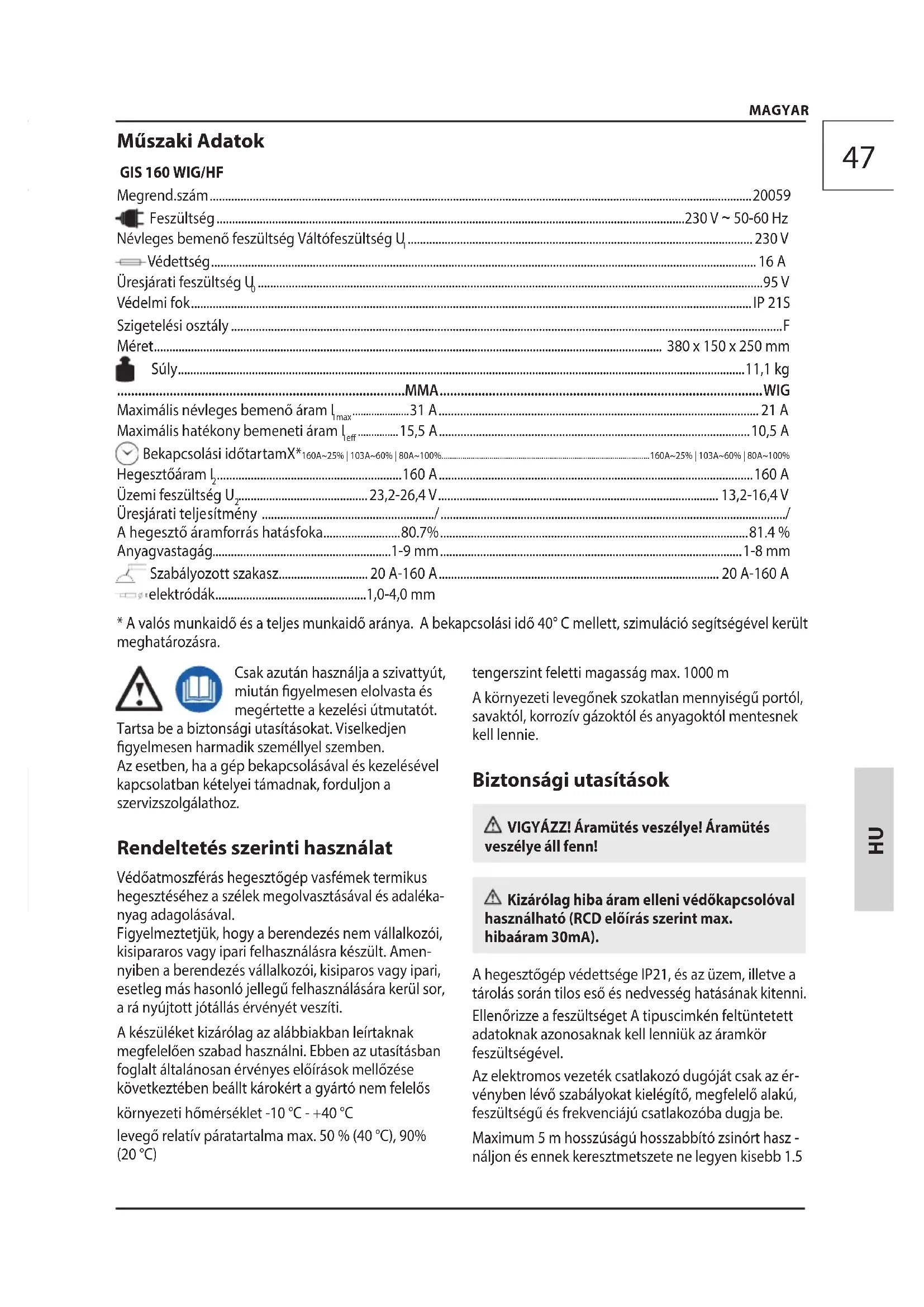 tengerszint feletti magasság max. 1000 m A környezeti levegőnek szokatlan mennyiségű portól, savaktól, korrozív gázoktól és anyagoktól mentesnek kell lennie. Biztonsági utasítások VIGYÁZZ! Áramütés veszélye! Áramütés veszélye áll fenn! Kizárólag hiba áram elleni védőkapcsolóval használható (RCD előírás szerint max. hibaáram 30mA). A hegesztőgép védettsége IP21, és az üzem, illetve a tárolás során tilos eső és nedvesség hatásának kitenni. Ellenőrizze a feszültséget A tipuscimkén feltüntetett adatoknak azonosaknak kell lenniük az áramkör feszültségével. Az elektromos vezeték csatlakozó dugóját csak az ér