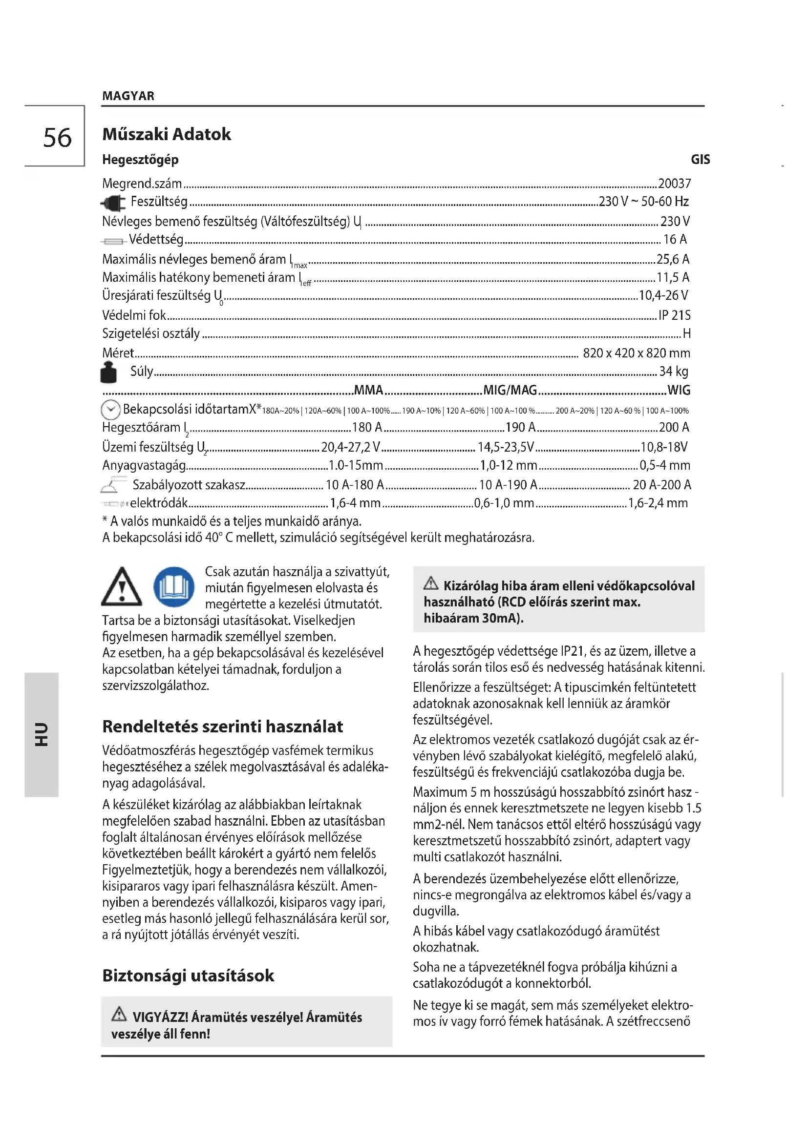 Csak azután használja a szivattyút, miután gyelmesen elolvasta és megértette a kezelési útmutatót. Tartsa be a biztonsági utasításokat. Viselkedjen gyelmesen harmadik személlyel szemben. Az esetben, ha a gép bekapcsolásával és kezelésével kapcsolatban kételyei támadnak, forduljon a szervizszolgálathoz. Rendeltetés szerinti használat Védőatmoszférás hegesztőgép vasfémek termikus hegesztéséhez a szélek megolvasztásával és adaléka- nyag adagolásával. A készüléket kizárólag az alábbiakban leírtaknak megfelelően szabad használni. Ebben az utasításban foglalt általánosan érvényes előírások mellőzése következtében beállt károkért a gyártó nem felelős Figyelmeztetjük, hogy a berendezés nem vállalkozói, kisipararos vagy ipari felhasználásra készült. Amen- nyiben a berendezés vállalkozói, kisiparos vagy ipari, esetleg más hasonló jellegű felhasználására kerül sor, a rá nyújtott jótállás érvényét veszíti. Biztonsági utasítások VIGYÁZZ! Áramütés veszélye! Áramütés veszélye áll fenn! MAGYAR Műszaki Adatok Hegesztőgép GIS 200 Megrend.szám ................................................................................................................................................................................ 20037 Feszültség ........................................................................................................................................................230 V ~ 50-60 Hz Névleges bemenő feszültség (Váltófeszültség) U