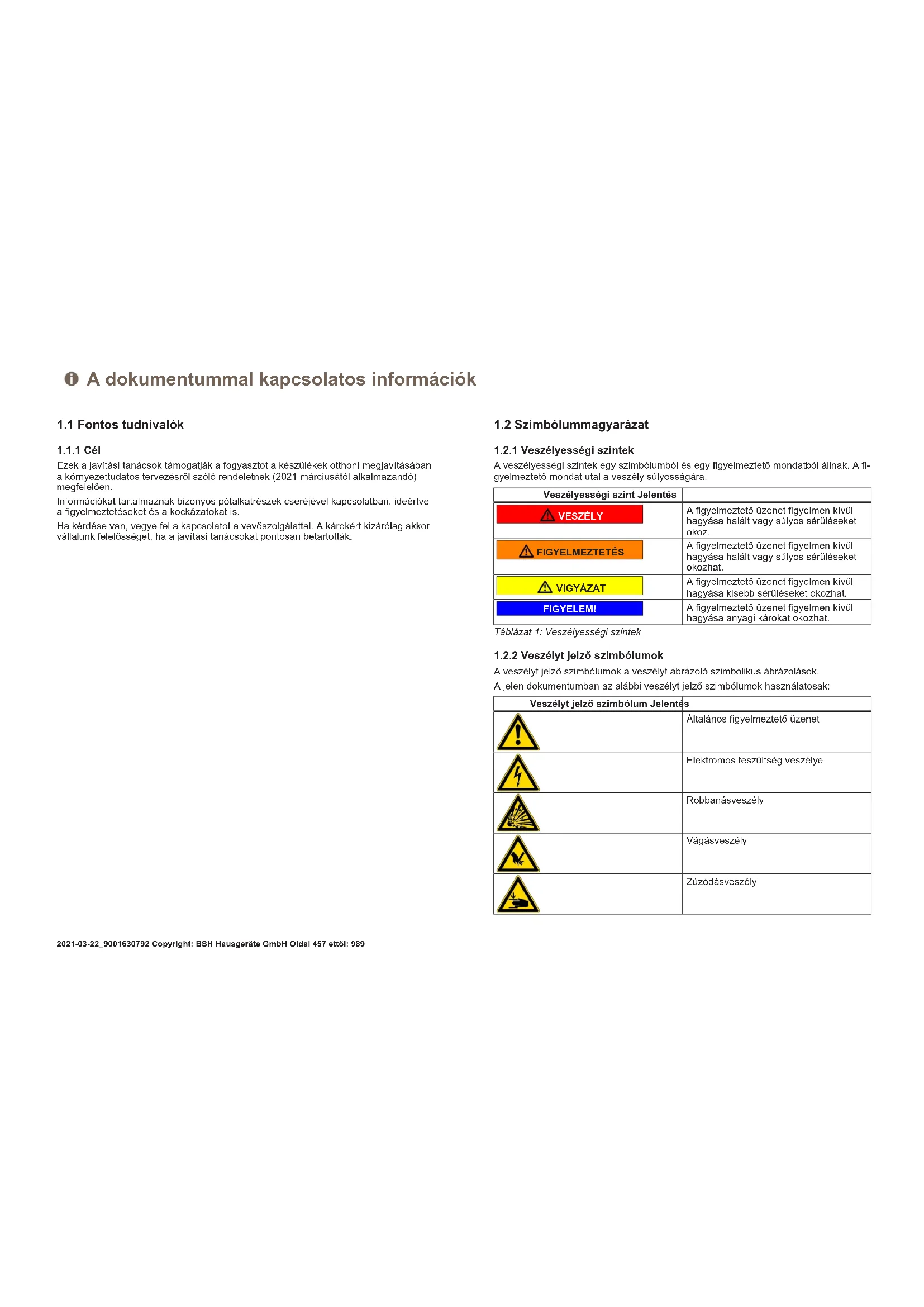 A veszélyt jelző szimbólumok a veszélyt ábrázoló szimbolikus ábrázolások. A jelen dokumentumban az alábbi veszélyt jelző szimbólumok használatosak: Veszélyt jelző szimbólum Jelentés Általános figyelmeztető üzenet Elektromos feszültség veszélye Robbanásveszély Vágásveszély Zúzódásveszély A dokumentummal kapcsolatos információk 2021-03-22_9001630792 Copyright: BSH Hausgeräte GmbH Oldal457ettől:989Veszélyt jelző szimbólum Jelentés Forró felületek miatt fennálló veszély Erős mágneses mező miatt fennálló ve- szély Nem ionizáló sugárzás veszélye Táblázat2: Veszélyt jelző szimbólumok