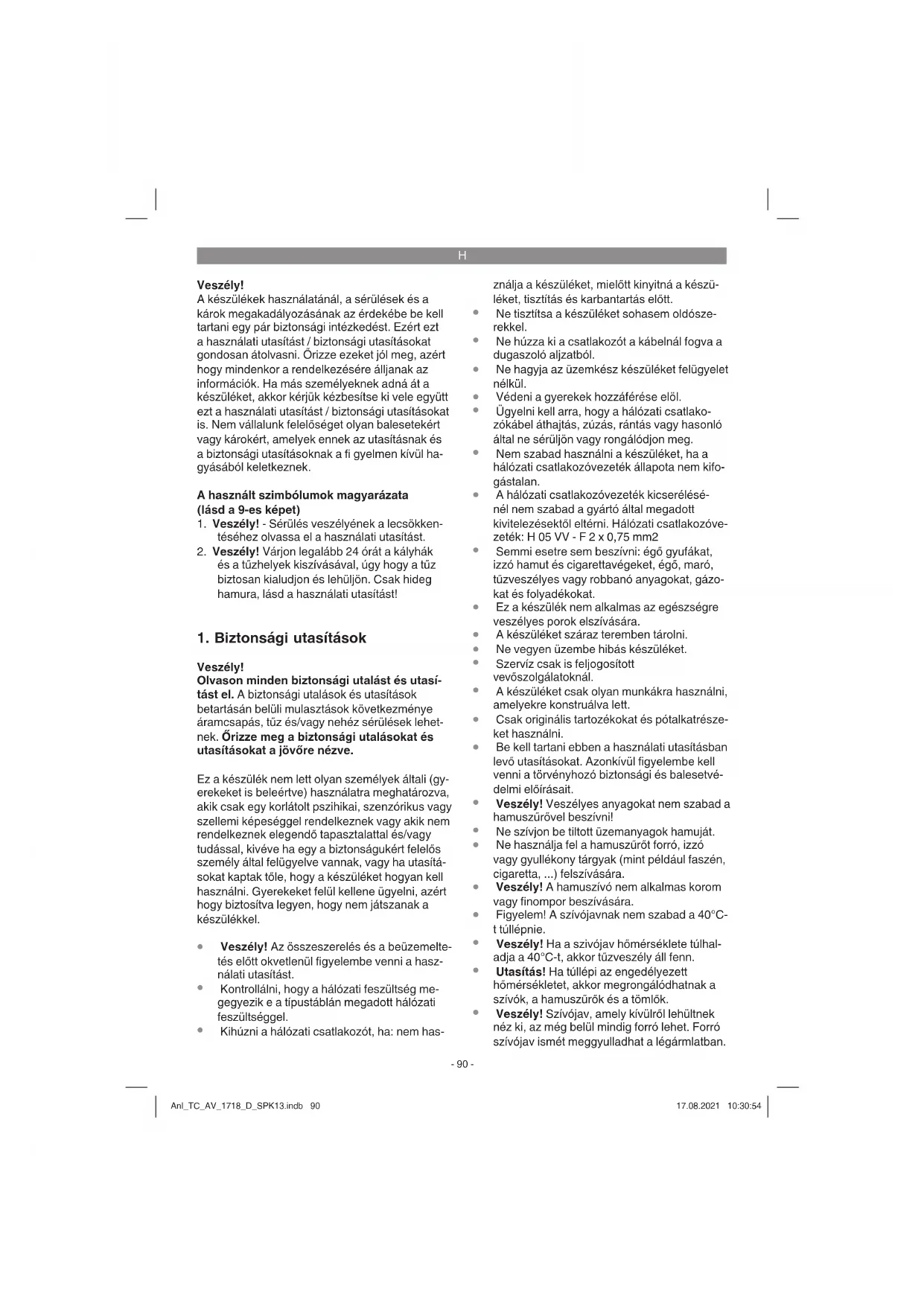 kicserélése Veszély! Ha ennek a készüléknek a hálózatra csatla- koztató vezetéke megsérült, akkor ezt a gyártó vagy annak a vevőszolgáltatása, vagy egy hason- lóan szakképzett személy által ki kell cseréltetni, azért hogy elkerülje a veszélyeztetéseket. Anl_TC_AV_1718_D_SPK13.indb 92Anl_TC_AV_1718_D_SPK13.indb 92 17.08.2021 10:30:5417.08.2021 10:30:54H