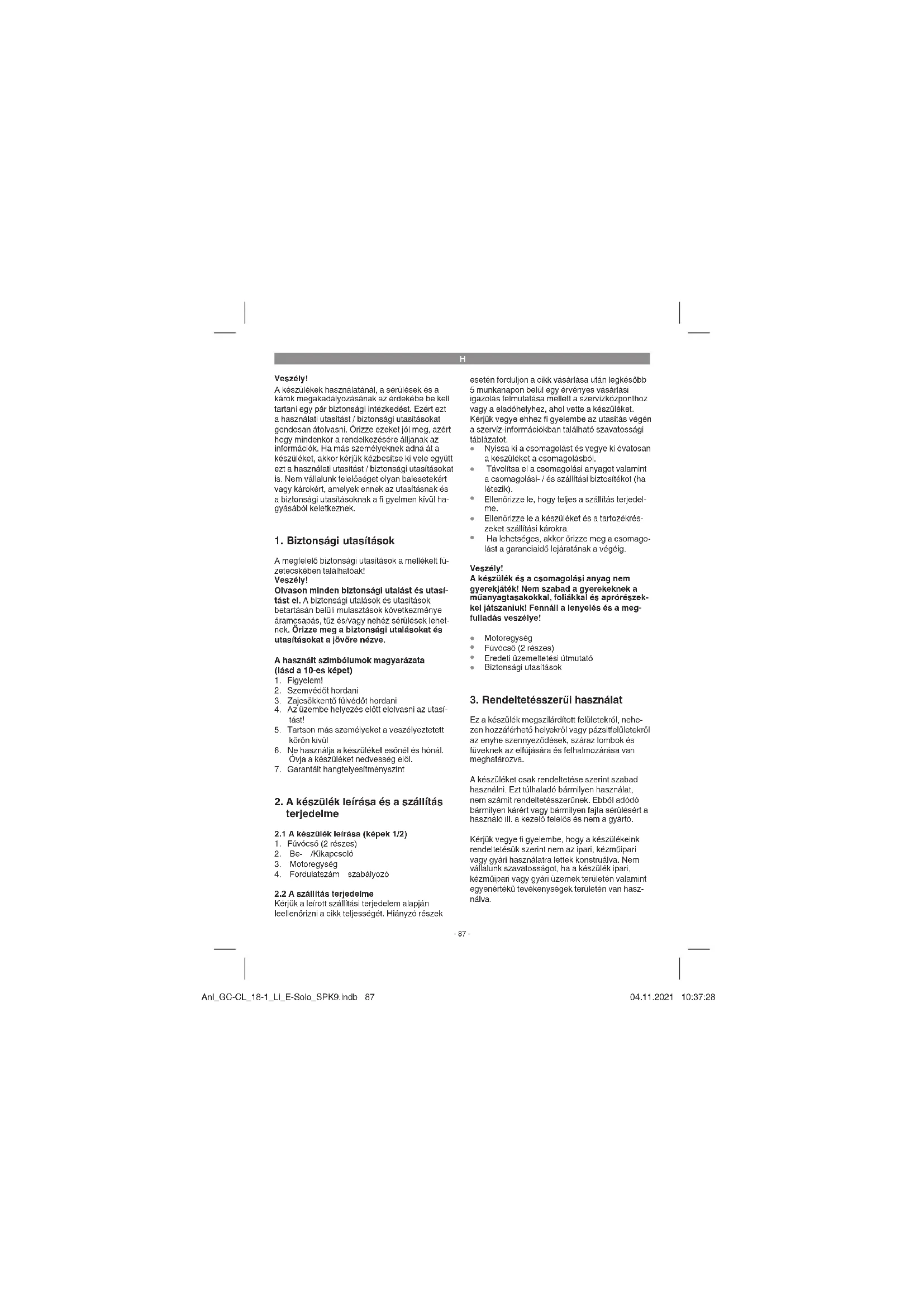 Ez a készülék megszilárdított felületekről, nehe- zen hozzáférhető helyekről vagy pázsitfelületekről az enyhe szennyeződések, száraz lombok és füveknek az elfújására és felhalmozárása van meghatározva. A készüléket csak rendeltetése szerint szabad használni. Ezt túlhaladó bármilyen használat, nem számít rendeltetésszerűnek. Ebből adódó bármilyen kárért vagy bármilyen fajta sérülésért a használó ill. a kezelő felelős és nem a gyártó. Kérjük vegye fi gyelembe, hogy a készülékeink rendeltetésük szerint nem az ipari, kézműipari vagy gyári használatra lettek konstruálva. Nem vállalunk szavatosságot, ha a készülék ipari, kézműipari vagy gyári üzemek területén valamint egyenértékű tevékenységek területén van hasz- nálva. Anl_GC-CL_18-1_Li_E-Solo_SPK9.indb 87Anl_GC-CL_18-1_Li_E-Solo_SPK9.indb 87 04.11.2021 10:37:2804.11.2021 10:37:28H