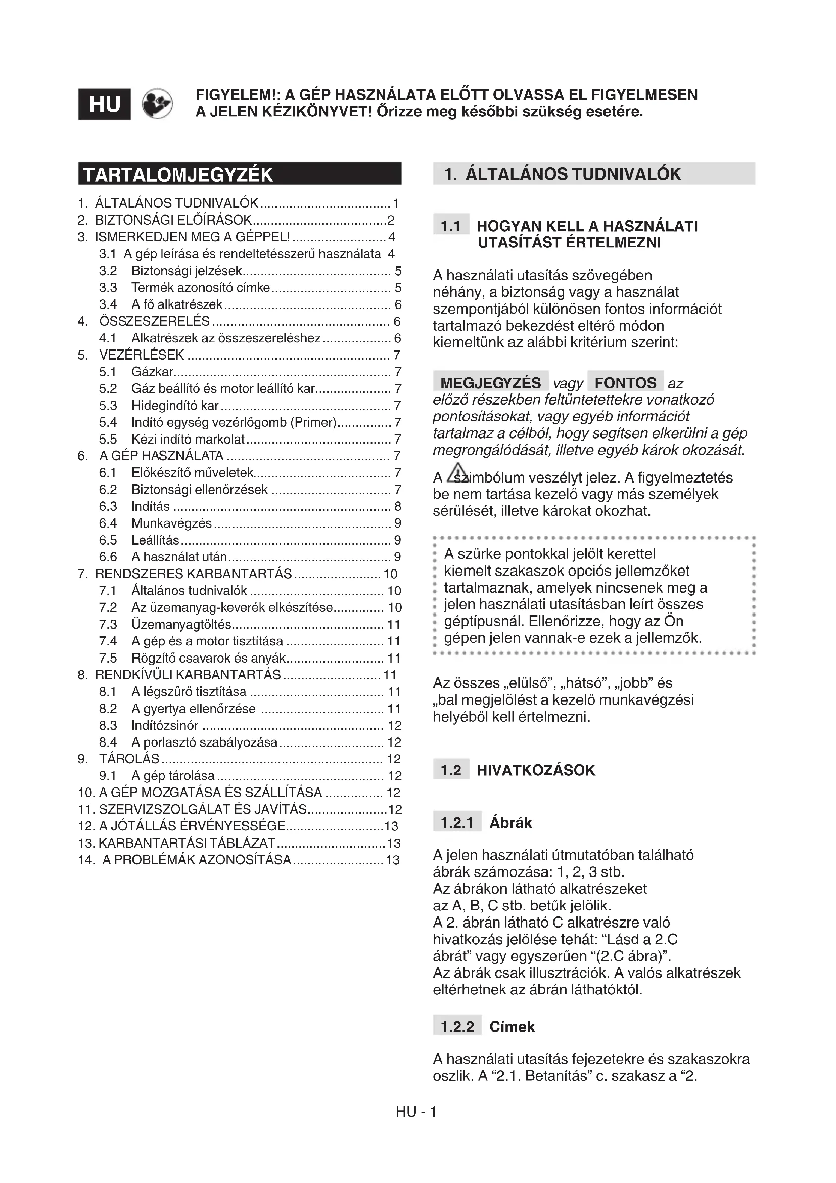 - A tűzveszély elkerülése érdekében ne hagyja a meleg motorú gépet levelek között, a száraz fűben vagy más gyúlékony anyag közelében. A helyes viselkedésre vonatkozó gyelmeztetések