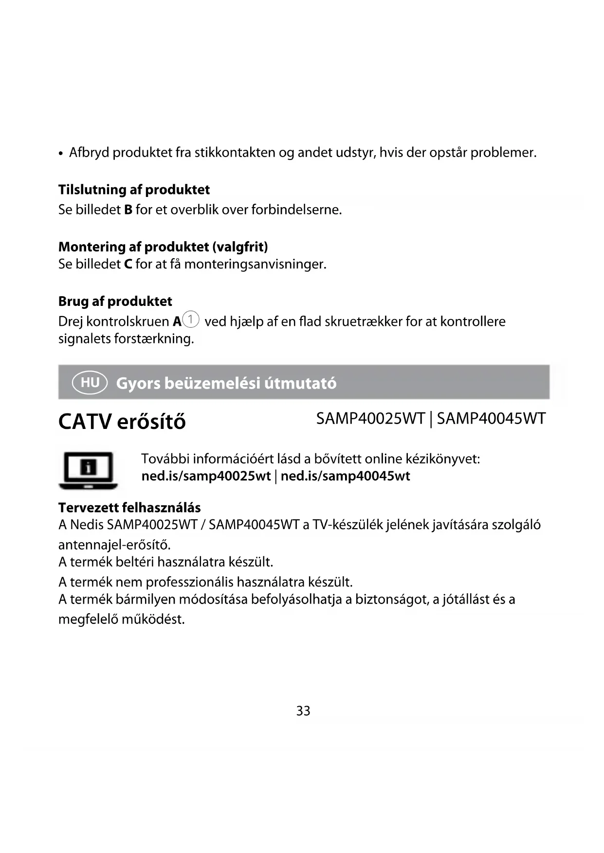 - Ha probléma merül fel, válassza le a terméket a hálózati csatlakozóaljzatról és más berendezésekről. A termék csatlakoztatása A csatlakoztatás áttekintését lásd a B képen. A termék felszerelése (opcionális) A szerelési utasításokat lásd a C képen. A termék használata A jelerősítés vezérléséhez laposfejű csavarhúzóval forgassa el a szabályzócsavart