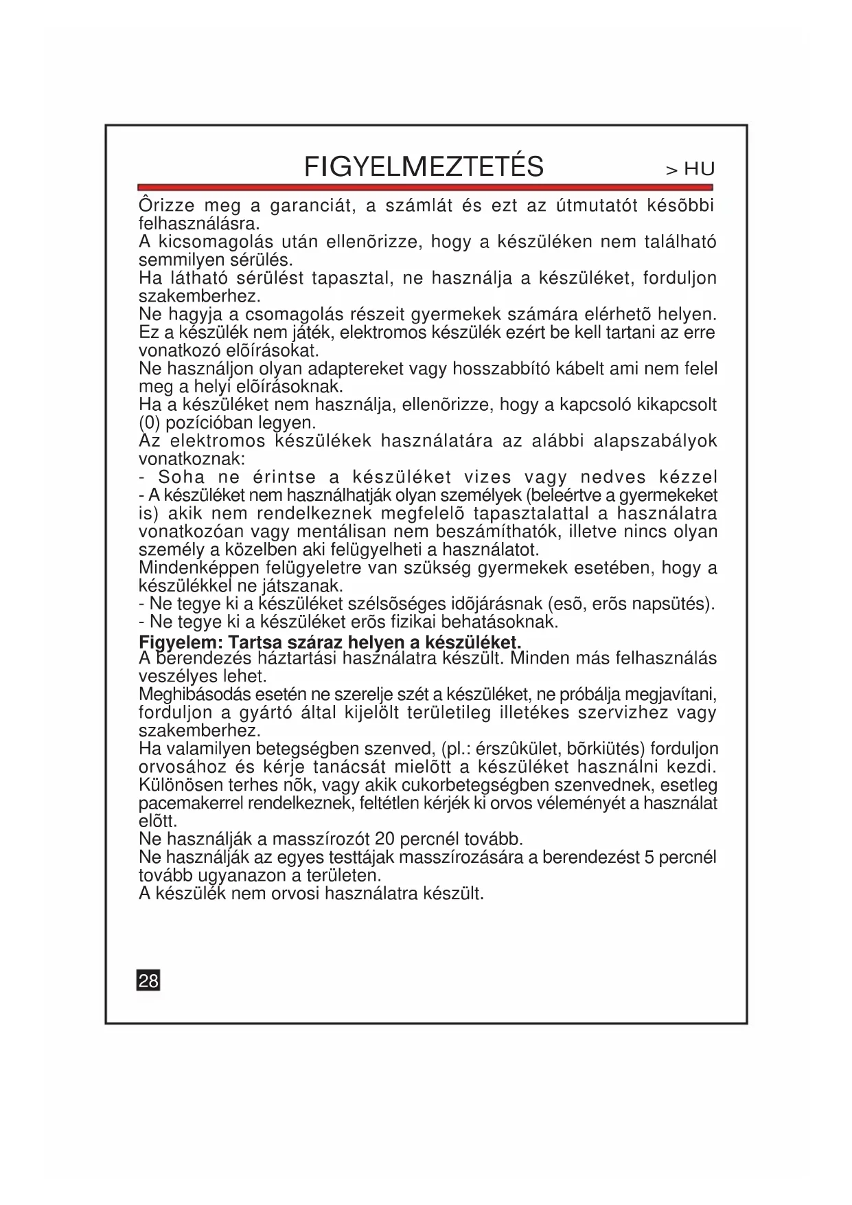 Ôrizze meg a garanciát, a számlát és ezt az útmutatót késõbbi felhasználásra. A kicsomagolás után ellenõrizze, hogy a készüléken nem található semmilyen sérülés. Ha látható sérülést tapasztal, ne használja a készüléket, forduljon szakemberhez. Ne hagyja a csomagolás részeit gyermekek számára elérhetõ helyen. Ez a készülék nem játék, elektromos készülék ezért be kell tartani az erre vonatkozó elõírásokat. Ne használjon olyan adaptereket vagy hosszabbító kábelt ami nem felel meg a helyi elõírásoknak. Ha a készüléket nem használja, ellenõrizze, hogy a kapcsoló kikapcsolt (0) pozícióban legyen. Az elektromos készülékek használatára az alábbi alapszabályok vonatkoznak: - Soha ne érintse a készüléket vizes vagy nedves kézzel - A készüléket nem használhatják olyan személyek (beleértve a gyermekeket is) akik nem rendelkeznek megfelelõ tapasztalattal a használatra vonatkozóan vagy mentálisan nem beszámíthatók, illetve nincs olyan személy a közelben aki felügyelheti a használatot. Mindenképpen felügyeletre van szükség gyermekek esetében, hogy a készülékkel ne játszanak. - Ne tegye ki a készüléket szélsõséges idõjárásnak (esõ, erõs napsütés). - Ne tegye ki a készüléket erõs fizikai behatásoknak. Figyelem: Tartsa száraz helyen a készüléket. A berendezés háztartási használatra készült. Minden más felhasználás veszélyes lehet. Meghibásodás esetén ne szerelje szét a készüléket, ne próbálja megjavítani, forduljon a gyártó által kijelölt területileg illetékes szervizhez vagy szakemberhez. Ha valamilyen betegségben szenved, (pl.: érszûkület, bõrkiütés) forduljon orvosához és kérje tanácsát mielõtt a készüléket használni kezdi. Különösen terhes nõk, vagy akik cukorbetegségben szenvednek, esetleg pacemakerrel rendelkeznek, feltétlen kérjék ki orvos véleményét a használat elõtt. Ne használják a masszírozót 20 percnél tovább. Ne használják az egyes testtájak masszírozására a berendezést 5 percnél tovább ugyanazon a területen. A készülék nem orvosi használatra készült.MÛSZAKI ADATOK >HU