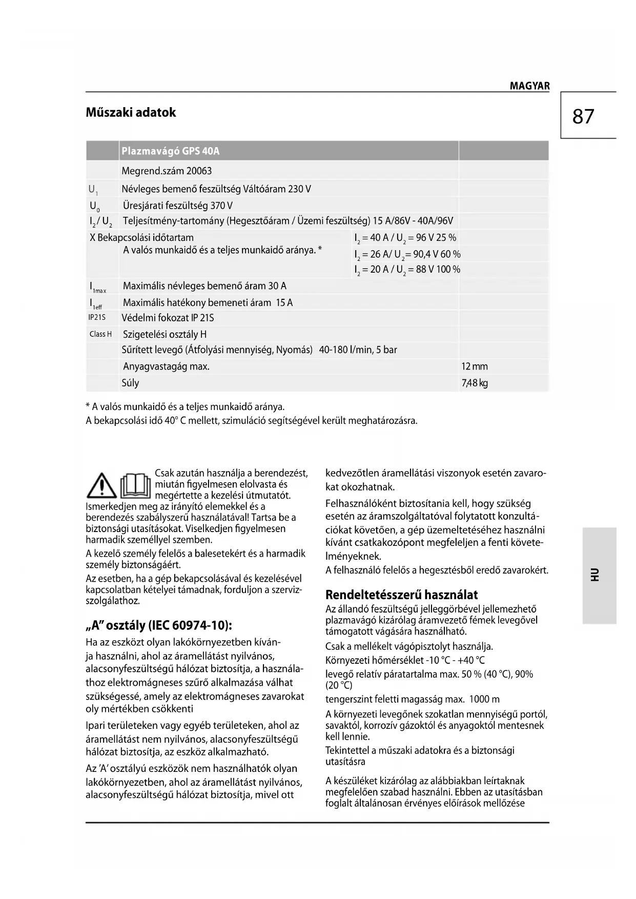 ciókat követően, a gép üzemeltetéséhez használni kívánt csatkakozópont megfeleljen a fenti követe- lményeknek. A felhasználó felelős a hegesztésből eredő zavarokért. Rendeltetésszerű használat Az állandó feszültségű jelleggörbével jellemezhető plazmavágó kizárólag áramvezető fémek levegővel támogatott vágására használható. Csak a mellékelt vágópisztolyt használja. Környezeti hőmérséklet -10 °C - +40 °C levegő relatív páratartalma max. 50 % (40 °C), 90% (20 °C) tengerszint feletti magasság max. 1000 m A környezeti levegőnek szokatlan mennyiségű portól, savaktól, korrozív gázoktól és anyagoktól mentesnek kell lennie. Tekintettel a műszaki adatokra és a biztonsági utasításra A készüléket kizárólag az alábbiakban leírtaknak megfelelően szabad használni. Ebben az utasításban foglalt általánosan érvényes előírások mellőzése88 következtében beállt károkért a gyártó nem felelős. Figyelmeztetjük, hogy a berendezés nem vállalkozói, kisipararos vagy ipari felhasználásra készült. Amen