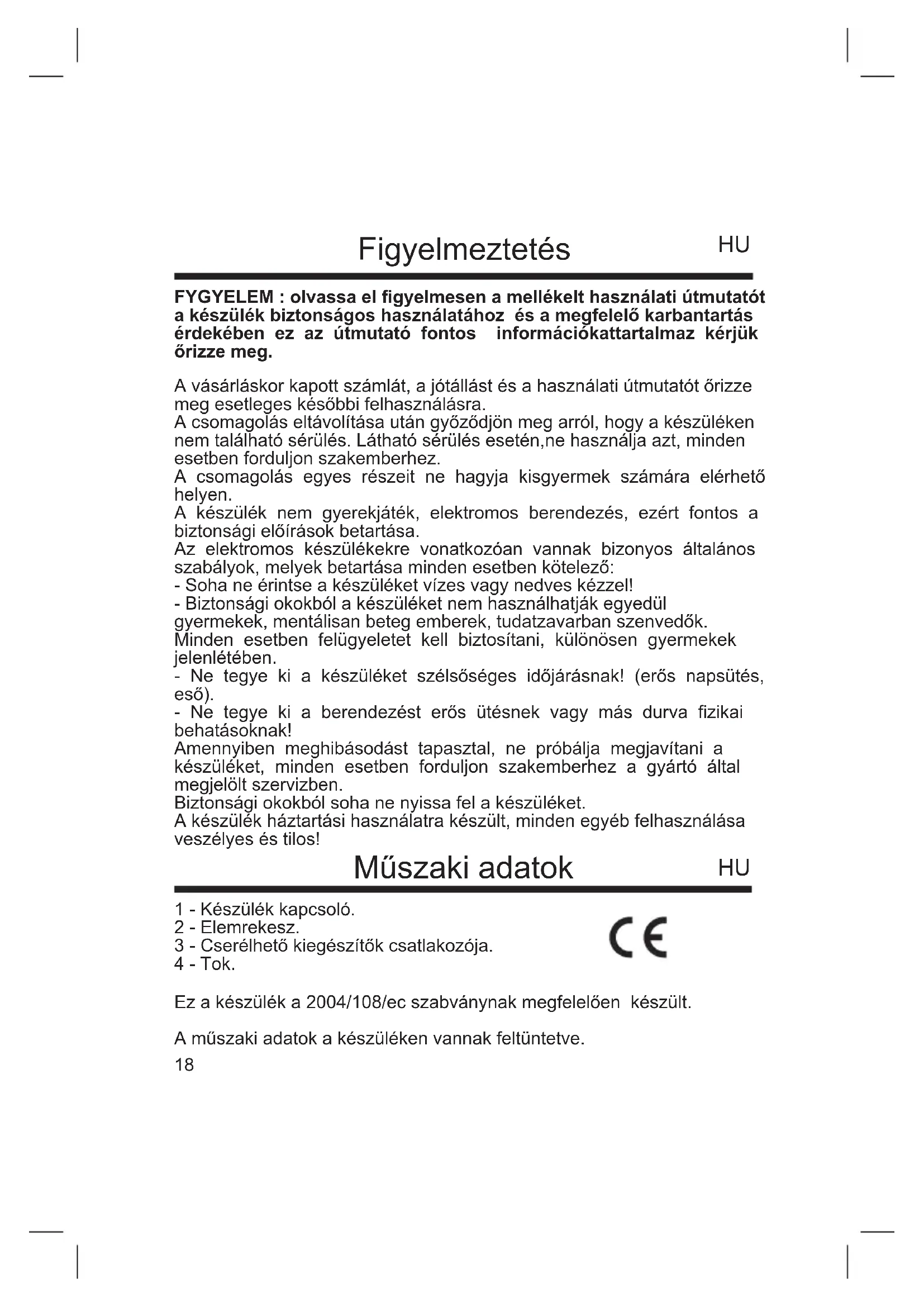 FYGYELEM : olvassa el gyelmesen a mellékelt használati útmutatót a készülék biztonságos használatához és a megfelelő karbantartás érdekében ez az útmutató fontos információkattartalmaz kérjük őrizze meg. A vásárláskor kapott számlát, a jótállást és a használati útmutatót őrizze meg esetleges későbbi felhasználásra. A csomagolás eltávolítása után győződjön meg arról, hogy a készüléken nem található sérülés. Látható sérülés esetén,ne használja azt, minden esetben forduljon szakemberhez. A csomagolás egyes részeit ne hagyja kisgyermek számára elérhető helyen. A készülék nem gyerekjáték, elektromos berendezés, ezért fontos a biztonsági előírások betartása. Az elektromos készülékekre vonatkozóan vannak bizonyos általános szabályok, melyek betartása minden esetben kötelező: - Soha ne érintse a készüléket vízes vagy nedves kézzel! - Biztonsági okokból a készüléket nem használhatják egyedül gyermekek, mentálisan beteg emberek, tudatzavarban szenvedők. Minden esetben felügyeletet kell biztosítani, különösen gyermekek jelenlétében. - Ne tegye ki a készüléket szélsőséges időjárásnak! (erős napsütés, eső). - Ne tegye ki a berendezést erős ütésnek vagy más durva zikai behatásoknak! Amennyiben meghibásodást tapasztal, ne próbálja megjavítani a készüléket, minden esetben forduljon szakemberhez a gyártó által megjelölt szervizben. Biztonsági okokból soha ne nyissa fel a készüléket. A készülék háztartási használatra készült, minden egyéb felhasználása veszélyes és tilos! Ez a készülék a 2004/108/ec szabványnak megfelelően készült. A műszaki adatok a készüléken vannak feltüntetve.