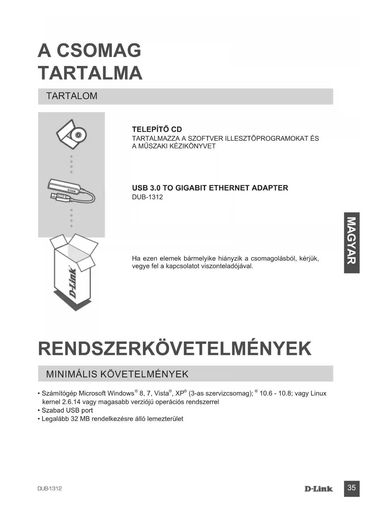 USB 3.0 TO GIGABIT ETHERNET AdAPTER DUB-1312 TARTALOM Ha ezen elemek bármelyike hiányzik a csomagolásból, kérjük, vegye fel a kapcsolatot viszonteladójával.