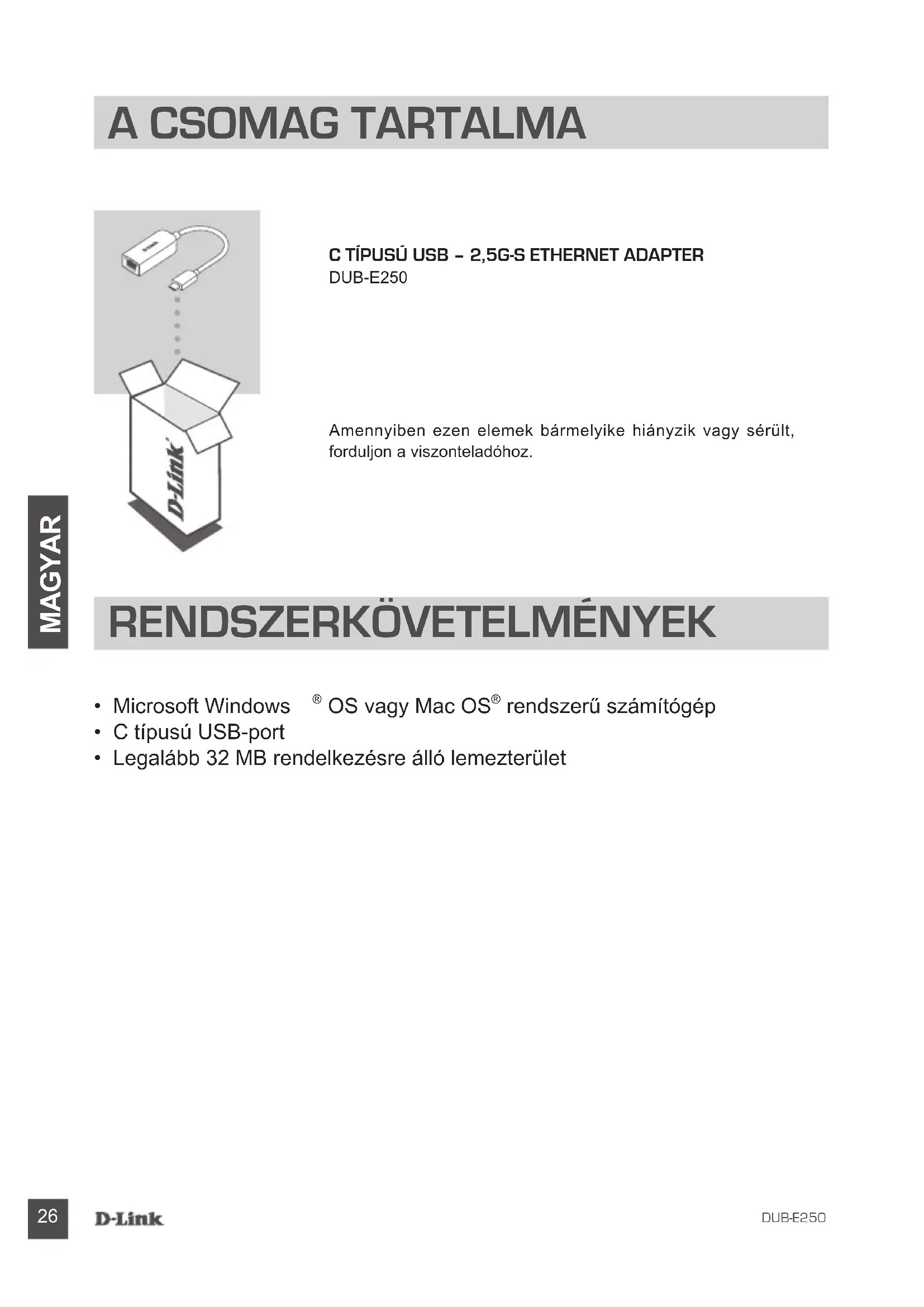 MAGYAR C tÍpUSÚ USB – 2,5G-S EthErnEt AdAptEr DUB-E250 Amennyiben ezen elemek bármelyike hiányzik vagy sérült, forduljon a viszonteladóhoz. A CSoMAG tArtALMA rEndSZErKÖVEtELMÉnYEK