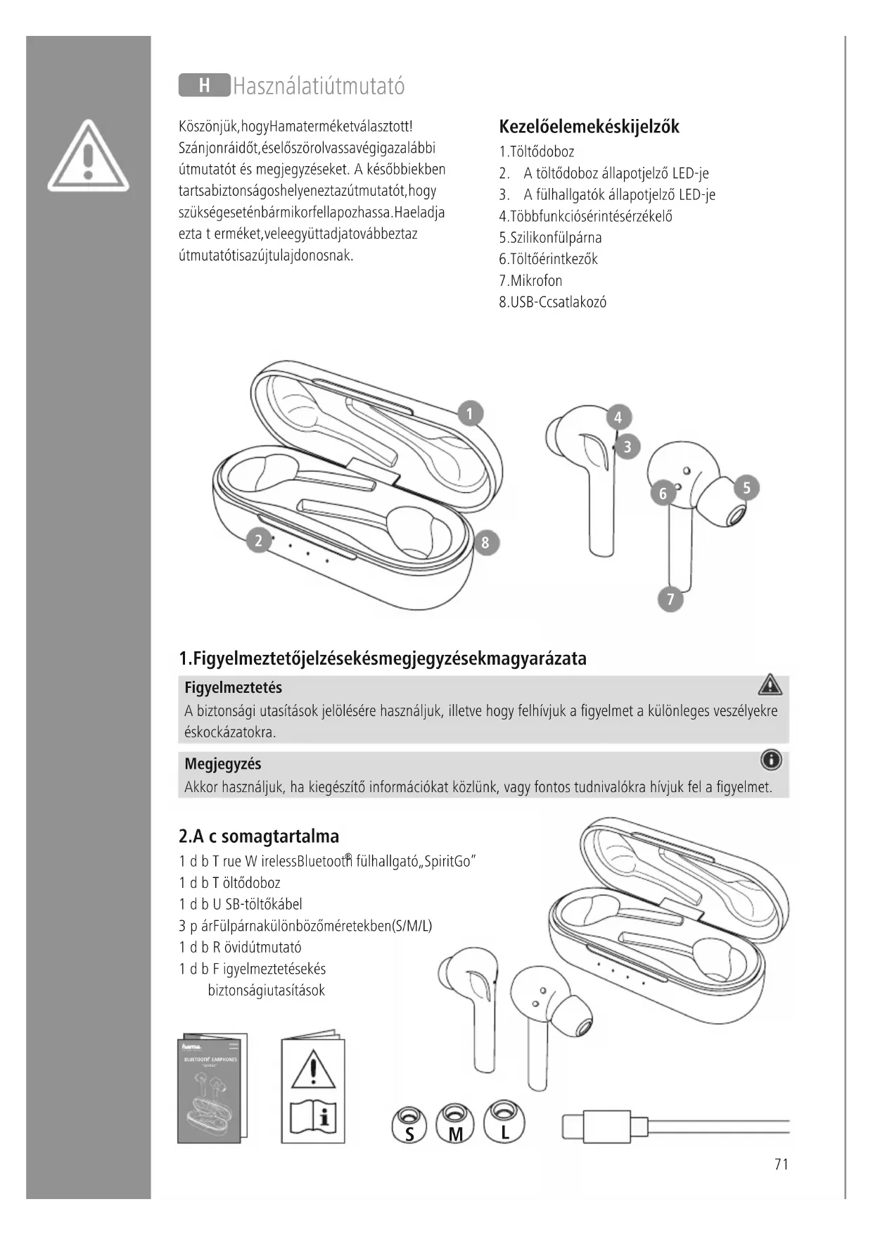 fülhallgató „Spirit Go” 1dbTöltődoboz 1dbUSB-töltőkábel 3pár Fülpárna különböző méretekben (S/M/L) 1dbRövid útmutató 1dbFigyelmeztetések és biztonsági utasítások