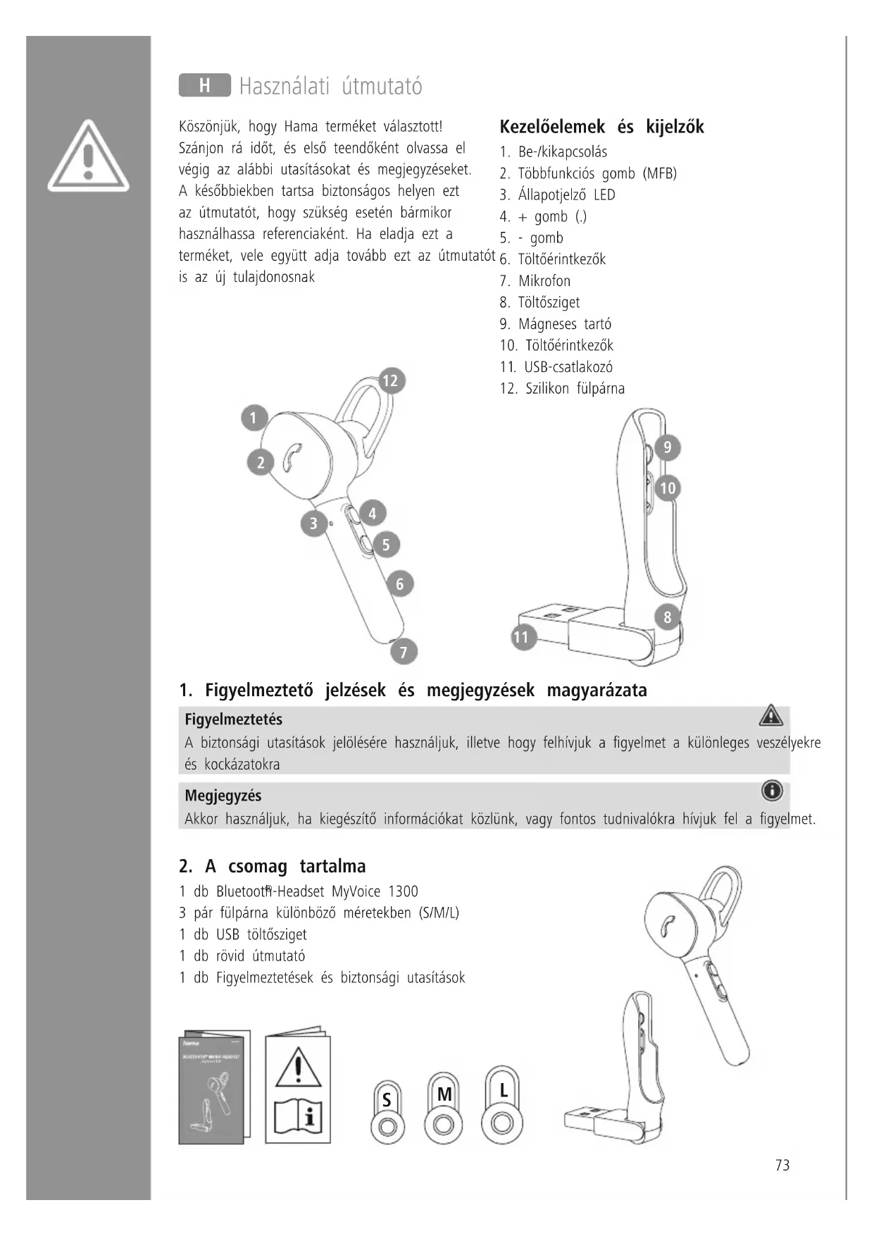 -Headset MyVoice 1300 3 pár fülpárna különböző méretekben (S/M/L) 1 db USB töltősziget 1 db rövid útmutató 1 db Figyelmeztetések és biztonsági utasítások