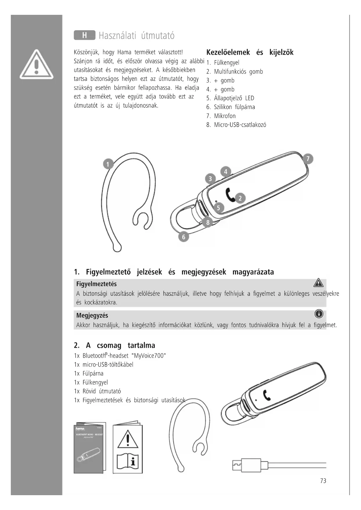 Hama GmbH & Co KG niniejszym oświadcza, że typ urządzenia radiowego [00184069] jest zgodny z dyrektywą 2014/53/UE Pełny tekst deklaracji zgodności UE jest dostępny pod następującym adresem internetowym: wwwhamacom->00184069-> Downloads Zakres(y) częstotliwości od 2402MHz do 2480MHz Promieniowana maksymalna moc transmisji 4dBm73 H Használati útmutató Köszönjük, hogy Hama terméket választott! Szánjon rá időt, és először olvassa végig az alábbi utasításokat és megjegyzéseket A későbbiekben tartsa biztonságos helyen ezt az útmutatót, hogy szükség esetén bármikor fellapozhassa Ha eladja ezt a terméket, vele együtt adja tovább ezt az útmutatót is az új tulajdonosnak Kezelőelemek és kijelzők 1 Fülkengyel 2 Multifunkciós gomb 3 + gomb 4 + gomb 5 Állapotjelző LED 6 Szilikon fülpárna 7 Mikrofon 8 Micro-USB-csatlakozó