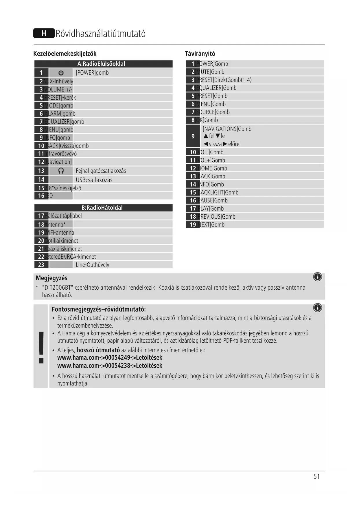 Találja meg az eszköz kézikönyvét ingyenesen DIT2006BT HAMA PDF formátumban.