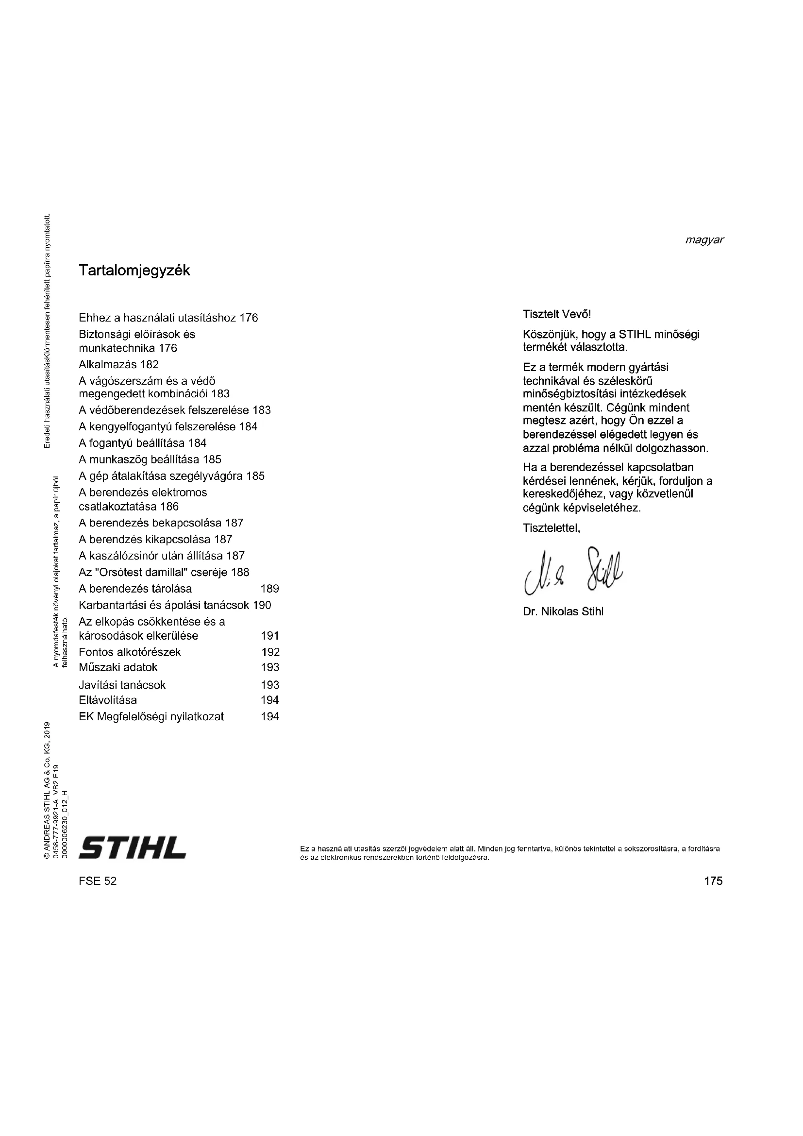 Ez a használati utasítás szerzői jogvédelem alatt áll. Minden jog fenntartva, különös tekintettel a sokszorosításra, a fordításra és az elektronikus rendszerekben történő feldolgozásra. Tartalomjegyzék Tisztelt Vevő! Köszönjük, hogy a STIHL minőségi termékét választotta. Ez a termék modern gyártási technikával és széleskörű minőségbiztosítási intézkedések mentén készült. Cégünk mindent megtesz azért, hogy Ön ezzel a berendezéssel elégedett legyen és azzal probléma nélkül dolgozhasson. Ha a berendezéssel kapcsolatban kérdései lennének, kérjük, forduljon a kereskedőjéhez, vagy közvetlenül cégünk képviseletéhez. Tisztelettel, Dr. Nikolas Stihl Ehhez a használati utasításhoz 176 Biztonsági előírások és munkatechnika 176 Alkalmazás 182 A vágószerszám és a védő megengedett kombinációi 183 A védőberendezések felszerelése 183 A kengyelfogantyú felszerelése 184 A fogantyú beállítása 184 A munkaszög beállítása 185 A gép átalakítása szegélyvágóra 185 A berendezés elektromos csatlakoztatása 186 A berendezés bekapcsolása 187 A berendzés kikapcsolása 187 A kaszálózsinór után állítása 187 Az "Orsótest damillal" cseréje 188 A berendezés tárolása 189 Karbantartási és ápolási tanácsok 190 Az elkopás csökkentése és a károsodások elkerülése 191 Fontos alkotórészek 192 Műszaki adatok 193 Javítási tanácsok 193 Eltávolítása 194 EK Megfelelőségi nyilatkozat 194FSE 52 magyar