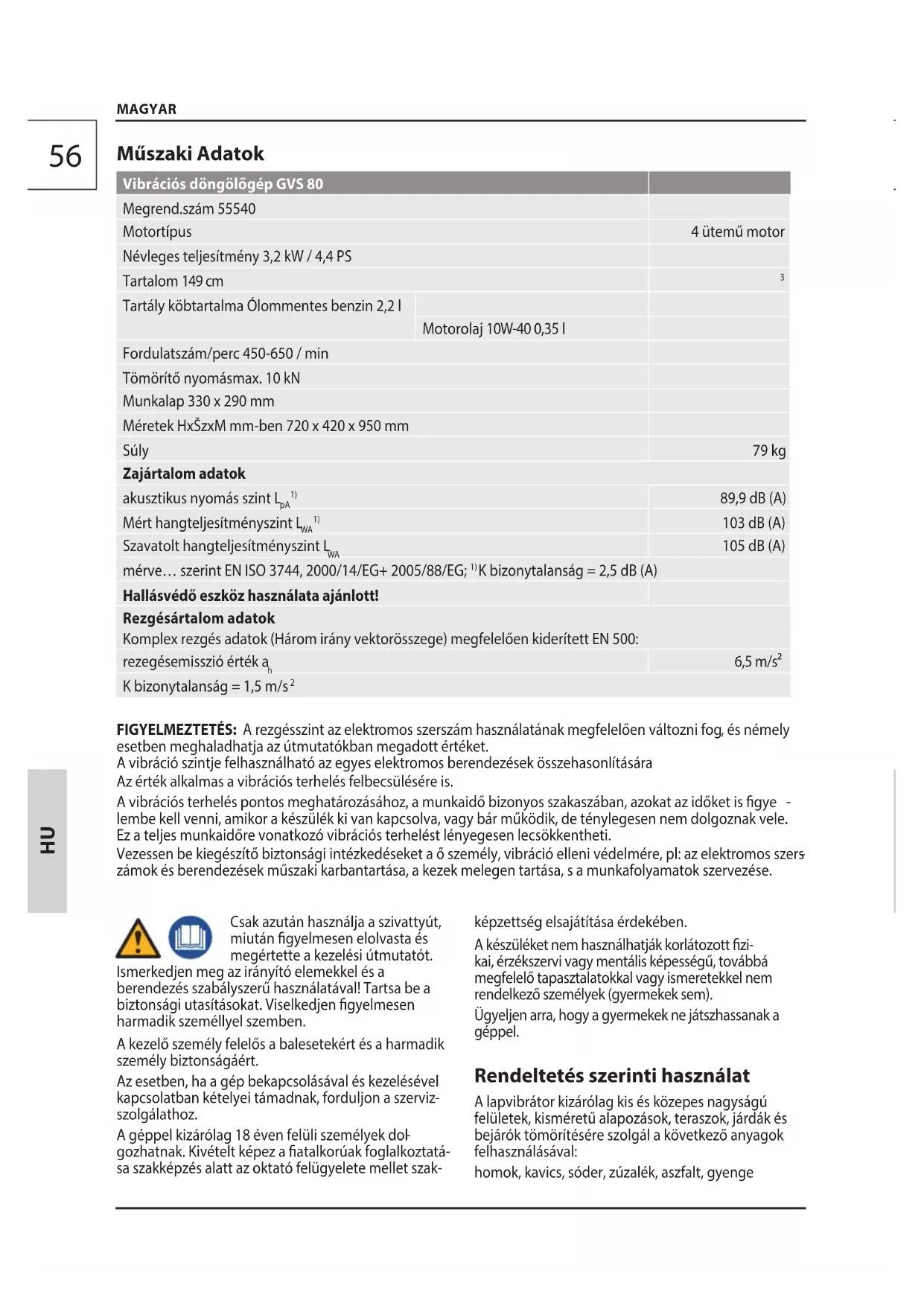 kai, érzékszervi vagy mentális képességű, továbbá megfelelő tapasztalatokkal vagy ismeretekkel nem rendelkező személyek (gyermekek sem). Ügyeljen arra, hogy a gyermekek ne játszhassanak a géppel. Rendeltetés szerinti használat A lapvibrátor kizárólag kis és közepes nagyságú felületek, kisméretű alapozások, teraszok, járdák és bejárók tömörítésére szolgál a következő anyagok felhasználásával: homok, kavics, sóder, zúzalék, aszfalt, gyenge57 MAGYAR