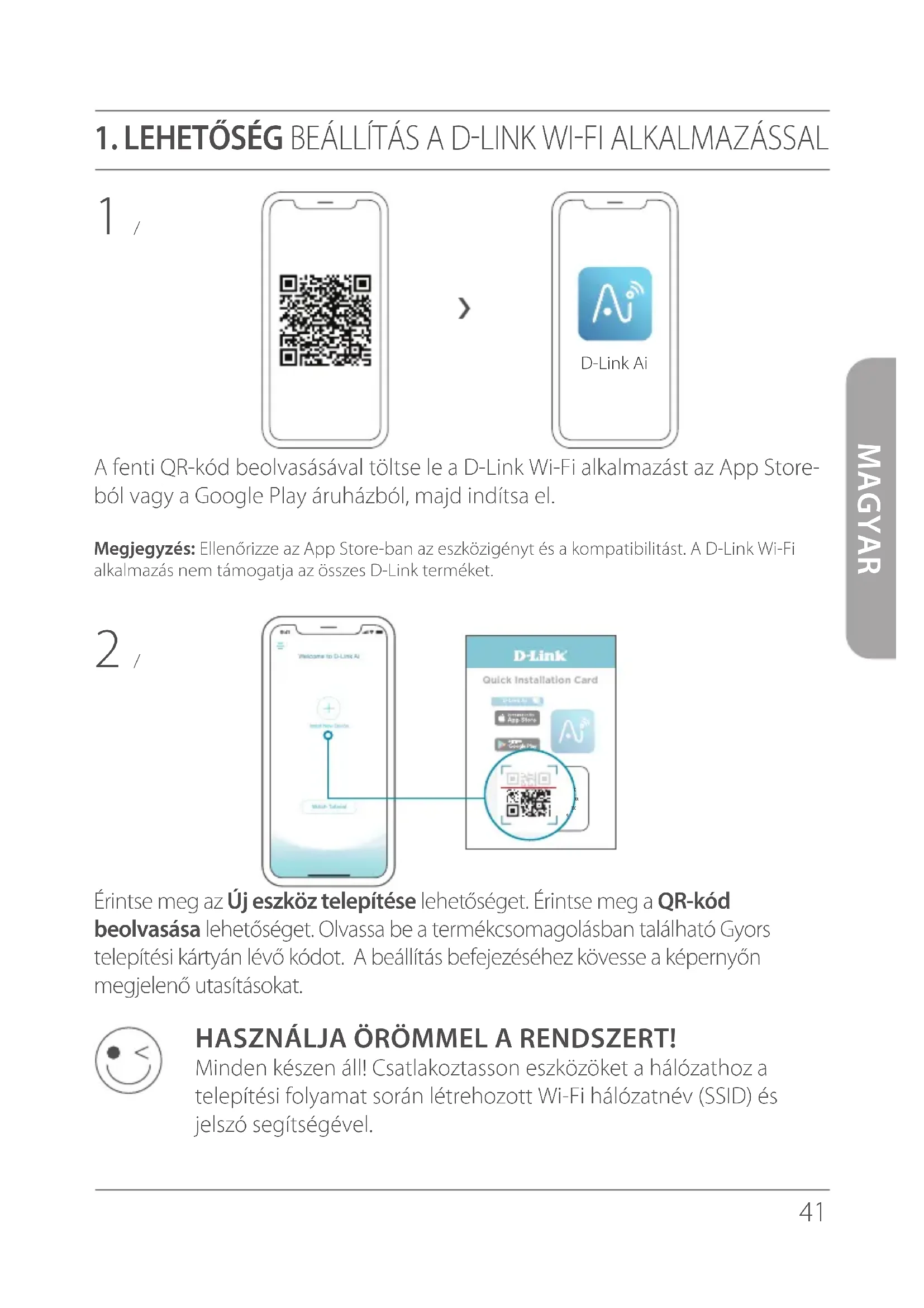 HASZNÁLJA ÖRÖMMEL A RENDSZERT! Minden készen áll! Csatlakoztasson eszközöket a hálózathoz a telepítési folyamat során létrehozott Wi-Fi hálózatnév (SSID) és jelszó segítségével. D-Link AiQuick Installation Card “D-Link Ai ” Model Name: DEVICE Wi-Fi Name: E15-XXXX Password: XXXXXXXX
