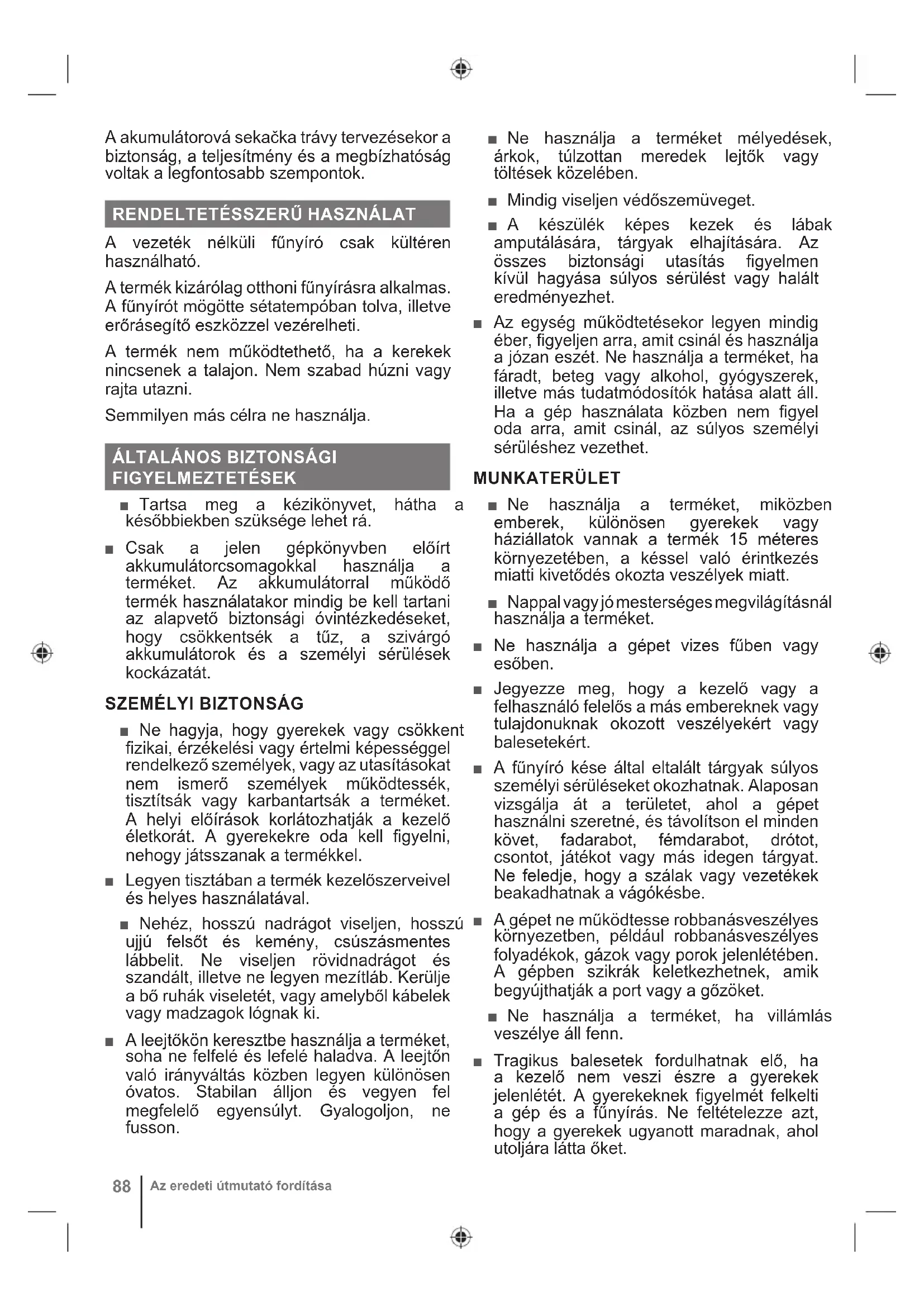 ■ Ne hagyja, hogy gyerekek vagy csökkent fizikai, érzékelési vagy értelmi képességgel rendelkező személyek, vagy az utasításokat nem ismerő személyek működtessék, tisztítsák vagy karbantartsák a terméket. A helyi előírások korlátozhatják a kezelő életkorát. A gyerekekre oda kell figyelni, nehogy játsszanak a termékkel. ■ Legyen tisztában a termék kezelőszerveivel és helyes használatával. ■ Nehéz, hosszú nadrágot viseljen, hosszú ujjú felsőt és kemény, csúszásmentes lábbelit. Ne viseljen rövidnadrágot és szandált, illetve ne legyen mezítláb. Kerülje a bő ruhák viseletét, vagy amelyből kábelek vagy madzagok lógnak ki. ■ A leejtőkön keresztbe használja a terméket, soha ne felfelé és lefelé haladva. A leejtőn való irányváltás közben legyen különösen óvatos. Stabilan álljon és vegyen fel megfelelő egyensúlyt. Gyalogoljon, ne fusson. ■ Ne használja a terméket mélyedések, árkok, túlzottan meredek lejtők vagy töltések közelében. ■ Mindig viseljen védőszemüveget. ■ A készülék képes kezek és lábak amputálására, tárgyak elhajítására. Az összes biztonsági utasítás figyelmen kívül hagyása súlyos sérülést vagy halált eredményezhet. ■ Az egység működtetésekor legyen mindig éber, figyeljen arra, amit csinál és használja a józan eszét. Ne használja a terméket, ha fáradt, beteg vagy alkohol, gyógyszerek, illetve más tudatmódosítók hatása alatt áll. Ha a gép használata közben nem figyel oda arra, amit csinál, az súlyos személyi sérüléshez vezethet. MUNKATERÜLET ■ Ne használja a terméket, miközben emberek, különösen gyerekek vagy háziállatok vannak a termék 15 méteres környezetében, a késsel való érintkezés miatti kivetődés okozta veszélyek miatt. ■ Nappal vagy jó mesterséges megvilágításnál használja a terméket. ■ Ne használja a gépet vizes fűben vagy esőben. ■ Jegyezze meg, hogy a kezelő vagy a felhasználó felelős a más embereknek vagy tulajdonuknak okozott veszélyekért vagy balesetekért. ■ A fűnyíró kése által eltalált tárgyak súlyos személyi sérüléseket okozhatnak. Alaposan vizsgálja át a területet, ahol a gépet használni szeretné, és távolítson el minden követ, fadarabot, fémdarabot, drótot, csontot, játékot vagy más idegen tárgyat. Ne feledje, hogy a szálak vagy vezetékek beakadhatnak a vágókésbe. ■ A gépet ne működtesse robbanásveszélyes környezetben, például robbanásveszélyes folyadékok, gázok vagy porok jelenlétében. A gépben szikrák keletkezhetnek, amik begyújthatják a port vagy a gőzöket. ■ Ne használja a terméket, ha villámlás veszélye áll fenn. ■ Tragikus balesetek fordulhatnak elő, ha a kezelő nem veszi észre a gyerekek jelenlétét. A gyerekeknek figyelmét felkelti a gép és a fűnyírás. Ne feltételezze azt, hogy a gyerekek ugyanott maradnak, ahol utoljára látta őket.MAGYAR