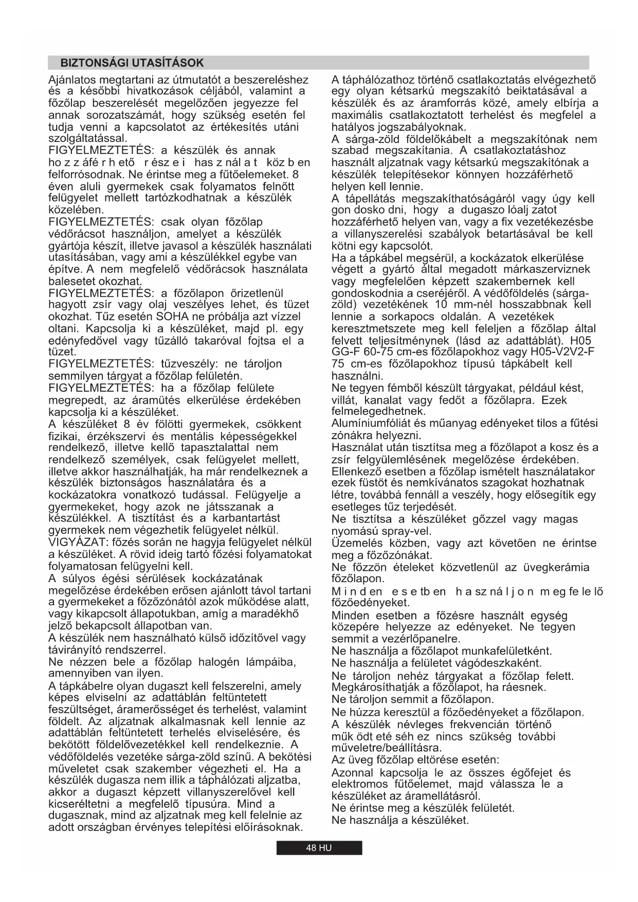 No entanto, se quiser proceder à substituição das grelhas e dos queimadores escurecidos, basta entrar em contacto com a nossa assistência técnica, à qual poderá adquirir as peças sobressalentes em causa. Chapa de Queimador 4 Gás - L1 - STD 4 Gás - L2 - Diamond 4 Gás - L3 - Big Rear 4 Gás - L4 - Big Front 5 Gás - L5 - Central 5 Gás - L6 - 4+1 Queimador AUX/SR/2R AUX/SR/2R AUX/SR/R/DC AUX/SR/R/DC AUX/SR/2R/DC AUX/SR/2R/DC Tipo PVUH60MF PVUH60MF PVUH60MF PVUH60MF PVUH75MF PVUH75MF FFD sì sì sì sì sì sì AUX 1kW 1 1 1 1 1 1 SR 1,75 kW 2 1 1 1 1 2 R 2,7 kW 1 2 1 1 2 1 DC 4 kW Mono - - 1 - - - DC 4,2 kW Mono - - - 1 - 1 DC 4,5 kW Mono - - - - 1 - Entrada Nominal de Calor 7,2kW 8,15kW 9,45kW NG 9,65 kW LPG 9,45kW 12,65kW NG 11,4kW LPG 11,2kW G20/20 mbar 686 l/h 776 l/h 900 l/h 920 l/h 1204 l/h 1085 l/h G30/28-30 mbar 524 g/h 593 g/h 688 g/h 688 g/h 920 g/h 814 g/h Classe de instalação 3 3 3 3 3 3 Tensão/frequência V/Hz 220-240V 50/60Hz 220-240V 50/60Hz 220-240V 50/60Hz 220-240V 50/60Hz 220-240V 50/60Hz 220-240V 50/60Hz Potência absorvida 1 1 1 1 1 1 Isqueiro (ignição eléctrica) sì sì sì sì sì sì Dimensões do produto 595x505x42 595x505x42 595x505x42 595x505x42 745x505x42 745x505x4248 HU FIGYELMEZTETÉS: tűzveszély: ne tároljon semmilyen tárgyat a főzőlap felületén. FIGYELMEZTETÉS: csak olyan főzőlap védőrácsot használjon, amelyet a készülék gyártója készít, illetve javasol a készülék használati utasításában, vagy ami a készülékkel egybe van építve. A nem megfelelő védőrácsok használata balesetet okozhat. FIGYELMEZTETÉS: a készülék és annak ho z z áfé r h ető r ész e i has z nál a t köz b en felforrósodnak. Ne érintse meg a fűtőelemeket. 8 éven aluli gyermekek csak folyamatos felnőtt felügyelet mellett tartózkodhatnak a készülék közelében. A készüléket 8 év fölötti gyermekek, csökkent fizikai, érzékszervi és mentális képességekkel rendelkező, illetve kellő tapasztalattal nem rendelkező személyek, csak felügyelet mellett, illetve akkor használhatják, ha már rendelkeznek a készülék biztonságos használatára és a kockázatokra vonatkozó tudással. Felügyelje a gyermekeket, hogy azok ne játsszanak a készülékkel. A tisztítást és a karbantartást gyermekek nem végezhetik felügyelet nélkül. A készülék nem használható külső időzítővel vagy távirányító rendszerrel. Ne nézzen bele a főzőlap halogén lámpáiba, amennyiben van ilyen. A súlyos égési sérülések kockázatának megelőzése érdekében erősen ajánlott távol tartani a gyermekeket a főzőzónától azok működése alatt, vagy kikapcsolt állapotukban, amíg a maradékhő jelző bekapcsolt állapotban van. FIGYELMEZTETÉS: a főzőlapon őrizetlenül hagyott zsír vagy olaj veszélyes lehet, és tüzet okozhat. Tűz esetén SOHA ne próbálja azt vízzel oltani. Kapcsolja ki a készüléket, majd pl. egy edényfedővel vagy tűzálló takaróval fojtsa el a tüzet. A tápkábelre olyan dugaszt kell felszerelni, amely képes elviselni az adattáblán feltüntetett feszültséget, áramerősséget és terhelést, valamint földelt. Az aljzatnak alkalmasnak kell lennie az adattáblán feltüntetett terhelés elviselésére, és bekötött földelővezetékkel kell rendelkeznie. A védőföldelés vezetéke sárga-zöld színű. A bekötési műveletet csak szakember végezheti el. Ha a készülék dugasza nem illik a táphálózati aljzatba, akkor a dugaszt képzett villanyszerelővel kell kicseréltetni a megfelelő típusúra. Mind a dugasznak, mind az aljzatnak meg kell felelnie az adott országban érvényes telepítési előírásoknak. Ajánlatos megtartani az útmutatót a beszereléshez és a későbbi hivatkozások céljából, valamint a főzőlap beszerelését megelőzően jegyezze fel annak sorozatszámát, hogy szükség esetén fel tudja venni a kapcsolatot az értékesítés utáni szolgáltatással. FIGYELMEZTETÉS: ha a főzőlap felülete megrepedt, az áramütés elkerülése érdekében kapcsolja ki a készüléket. VIGYÁZAT: főzés során ne hagyja felügyelet nélkül a készüléket. A rövid ideig tartó főzési folyamatokat folyamatosan felügyelni kell.