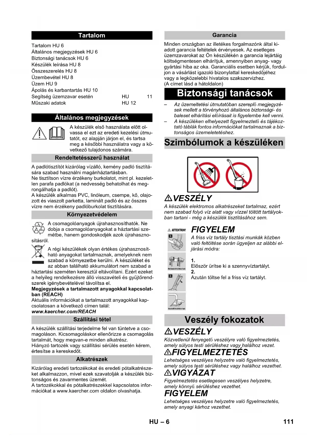 Масса (без принадлежностей и моющих жидкостей) 2,4 кг Длина 305 мм Ширина 226 мм высота 1220 мм 110 RU– 6 A készülék első használata előtt ol-vassa el ezt az eredeti kezelési útmu-tatót, ez alapján járjon el, és tartsa meg a későbbi használatra vagy a kö-vetkező tulajdonos számára.A padlótisztítót kizárólag vízálló, kemény padló tisztítá-sára szabad használni magánháztartásban.Ne tisztítson vízre érzékeny burkolatot, mint pl. kezelet-len parafa padlókat (a nedvesség behatolhat és meg-rongálhatja a padlót).A készülék alkalmas PVC, linóleum, csempe, kő, olajo-zott és viaszolt parketta, laminált padló és az összes vízre nem érzékeny padlóburkolat tisztítására.A csomagolóanyagok újrahasznosíthatók. Ne dobja a csomagolóanyagokat a háztartási sze-métbe, hanem gondoskodjék azok újrahaszno-sításról.A régi készülékek olyan értékes újrahasznosít-ható anyagokat tartalmaznak, amelyeknek nem szabad a környezetbe kerülni. A készüléket és az abban található akkumulátort nem szabad a háztartási szeméten keresztül eltávolítani. Ezért ezeket a helyileg rendelkezésre álló visszavételi és gyűjtőrend-szerek igénybevételével távolítsa el.Megjegyzések a tartalmazott anyagokkal kapcsolat-ban (REACH)Aktuális információkat a tartalmazott anyagokkal kap-csolatosan a következő címen talál: www.kaercher.com/REACHA készülék szállítási terjedelme fel van tüntetve a cso-magoláson. Kicsomagoláskor ellenőrizze a csomagolás tartalmát, hogy megvan-e minden alkatrész.Hiányzó tartozék vagy szállítási sérülés esetén kérem, értesítse a kereskedőt. Kizárólag eredeti tartozékokat és eredeti pótalkatrésze-ket alkalmazzon, mivel ezek szavatolják a készülék biz-tonságos és zavarmentes üzemét.A tartozékokkal és pótalkatrészekkel kapcsolatos infor-mációkat a www.kaercher.com oldalon olvashatja.Minden országban az illetékes forgalmazónk által ki-adott garancia feltételek érvényesek. Az esetleges üzemzavarokat az Ön készülékén a garancia lejártáig költségmentesen elhárítjuk, amennyiben anyag- vagy gyártási hiba az oka. Garanciális esetben kérjük, fordul-jon a vásárlást igazoló bizonylattal kereskedőjéhez vagy a legközelebbi hivatalos szakszervizhez.(A címet lásd a hátoldalon) – Az üzemeltetési útmutatóban szereplő megjegyzé- sek mellett a törvényhozó általános biztonsági- és baleset elhárítási előírásait is figyelembe kell venni. – A készüléken elhelyezett figyelmeztető és tájékoz- tató táblák fontos információkat tartalmaznak a biz-tonságos üzemeletetéshez. VESZÉLY Közvetlenül fenyegető veszélyre való figyelmeztetés, amely súlyos testi sérüléshez vagy halálhoz vezet. 몇 FIGYELMEZTETÉS Lehetséges veszélyes helyzetre való figyelmeztetés, amely súlyos testi sérüléshez vagy halálhoz vezethet. 몇 VIGYÁZAT Figyelmeztetés esetlegesen veszélyes helyzetre, amely könnyű sérüléshez vezethet. FIGYELEM Lehetséges veszélyes helyzetre való figyelmeztetés, amely anyagi kárhoz vezethet. Tartalom Tartalom HU 6Általános megjegyzések HU 6Biztonsági tanácsok HU 6Készülék leírása HU 8Összeszerelés HU 8Üzembevétel HU 8Üzem HU 9Ápolás és karbantartás HU 10Segítség üzemzavar esetén HU 11Műszaki adatok HU 12 Általános megjegyzések Rendeltetésszerű használat Környezetvédelem Szállítási tétel Alkatrészek Garancia Biztonsági tanácsok Szimbólumok a készüléken VESZÉLY A készülék elektromos alkatrészeket tartalmaz, ezért nem szabad folyó víz alatt vagy vízzel töltött tartályok-ban tartani - még a készülék tisztításához sem. FIGYELEM A friss víz tartály tisztási munkák közben való feltöltése során ügyeljen az alábbi el-járási módra: Először ürítse ki a szennyvíztartályt. Azután töltse fel a friss víz tartályt. Veszély fokozatok 111HU– 7 VESZÉLY A készüléket ne mártsa vízbe! A készülék és a tartozék előírásszerű állapotát használat előtt ellenőrizni kell. Ha a készülék álla- pota nem kifogástalan, akkor nem szabad használ- ni. A töltőkészüléket és a töltőkábelt látható sérülés esetén haladéktalanul ki kell cserélni eredeti alkat- részre. Minden ápolási- és karbantartási munka megkez- dése előtt kapcsolja ki a készüléket és húzza ki a hálózati csatlakozót. A készülék javítását csak erre jogosult ügyfélszol- gálat végezheti. A készülék elektromos alkatrészeket tartalmaz - ne tisztítsa folyóvíz alatt! Ne helyezzen vezető tárgyakat (pl. csavarhúzó vagy hasonló) a töltő csatlakozó dugaszába. Ne érintsen meg érintkezéseket vagy vezetékeket. A feszültség adata a típustáblán meg kell, hogy egyezzen az ellátási feszültséggel. A hálózati csatlakozókábelt ne húzza át éles sarko- kon és ne csípje be. 몇 FIGYELMEZTETÉS A készüléket csak olyan elektromos csatlakozóhoz szabad csatlakoztatni, amelyet egy elektromos szakember az IEC 60364 szerint kivitelezett. A készüléket csak váltakozó áramhoz szabad csat- lakoztatni. A feszültségnek meg kell egyeznie a ké- szülék típus tábláján lévővel. Biztonsági okokból alapvetően azt ajánljuk, hogy a készüléket hibaáram-védőkapcsolón (max. 30mA) keresztül üzemeltessék. VESZÉLY Áramütés veszélye. A hálózati csatlakozóhoz és a dugaljhoz soha nem szabad nedves kézzel nyúlni. A töltőkészüléket ne használja piszkos vagy ned- ves állapotban. A töltőkészüléket ne üzemeltesse robbanásveszé- lyes környezetben. Ne vigye a töltőkészüléket a hálózati kábelnél fog- va. A töltőkészüléket csak száraz helyiségben szabad használni és tárolni. A hálózati kábelt tartsa távol melegtől, éles pere- mektől, olajtól és a mozgó készülékrészektől. 
